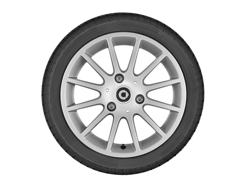 smart 12-Speichen-Leichtmetallräder aus Aluminium sind ein Muss für jeden smart Fahrer. Sie sind robust und langlebig, da sie härtesten Belastungstests standhalten müssen, bevor sie von unseren Sicherheitsingenieuren freigegeben werden. Dazu gehört die Analyse und Optimierung von Freigängigkeit, Fahr- und Bremsverhalten, die einer Laufleistung von mindestens 300.000 km entspricht - deutlich mehr als von den TÜV oder ETRTO verlangt. Darüber hinaus sind die Räder leicht zu reinigen und durch eine aufwändige Mehrschicht-Lackierung korrosionsgeschützt. Dieses Design 1 Rad ist 38,1 cm (15 Zoll) und für Bereifung 155/60 R15 vorne und 175/55 R15 hinten geeignet.