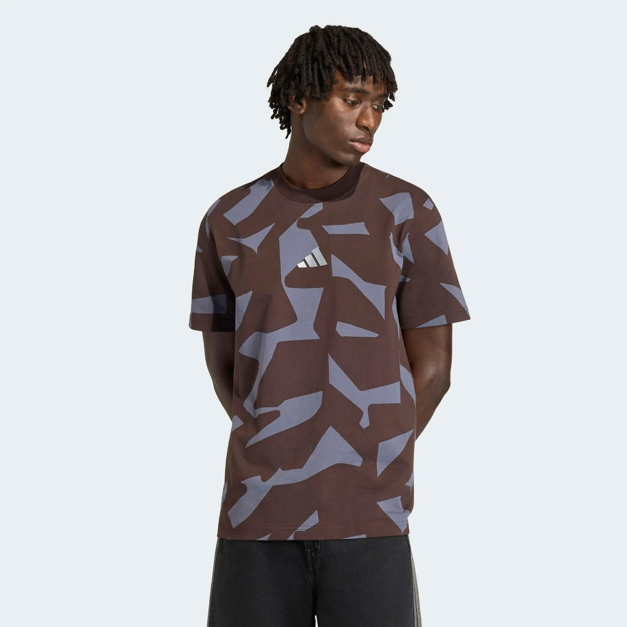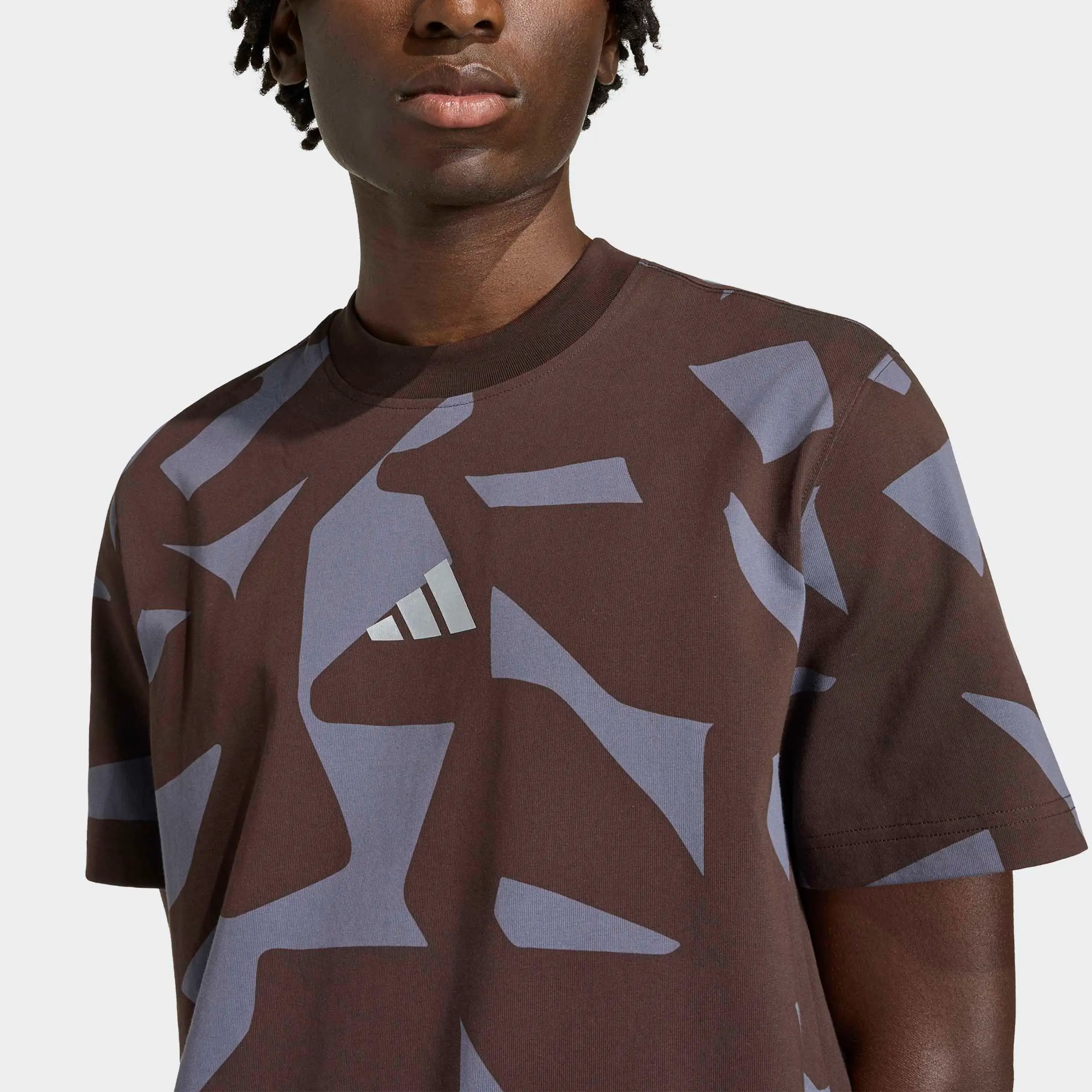 Die rasante Performance eines Mercedes-AMG auch im Alltag spüren: Mit dem dunkelbraunen AMG T-Shirt nichts leichter als das! Denn das Shirt zeigt einen allover Grafikdruck, der von den getarnten Folierungen inspiriert ist, wie sie auch zum Verbergen der AMG-Rennwagen der nächsten Generation verwendet werden. Abgerundet wird das sportliche Design durch ein adidas Logo auf der Brust sowie ein silberfarbenes AMG Logo auf der Rückseite.