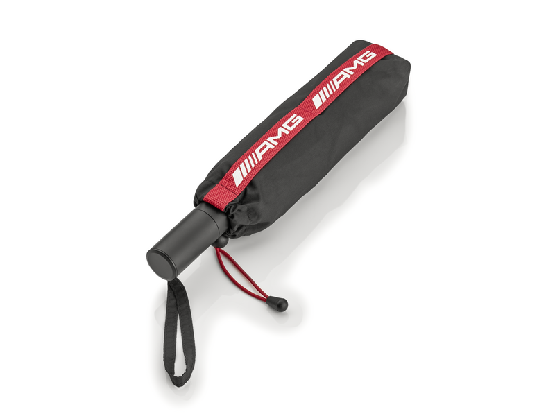 Der AMG Taschenschirm in Schwarz und Rot ist ein einzigartiges Accessoire, das nicht nur praktischen Schutz vor Regen und Schnee bietet, sondern auch in puncto Optik überzeugt. Die Schienen und der Stock sind in Rot gehalten, während die Scharniere, Schirmspitzen und das Top in Schwarz designt wurden. Ein silberfarbene Auslösetaste mit schwarzen AMG Rauten erleichtert das Öffnen des Schirms. Wenn er einmal nicht benötigt wird, lässt er sich leicht im schwarzen Futteral verstauen, auf dem sich ein dekoratives Band in Rot mit bedrucktem weißem AMG Logo befindet. Der ergonomisch geformte Griff sorgt für Komfort, auch bei längerem Tragen.