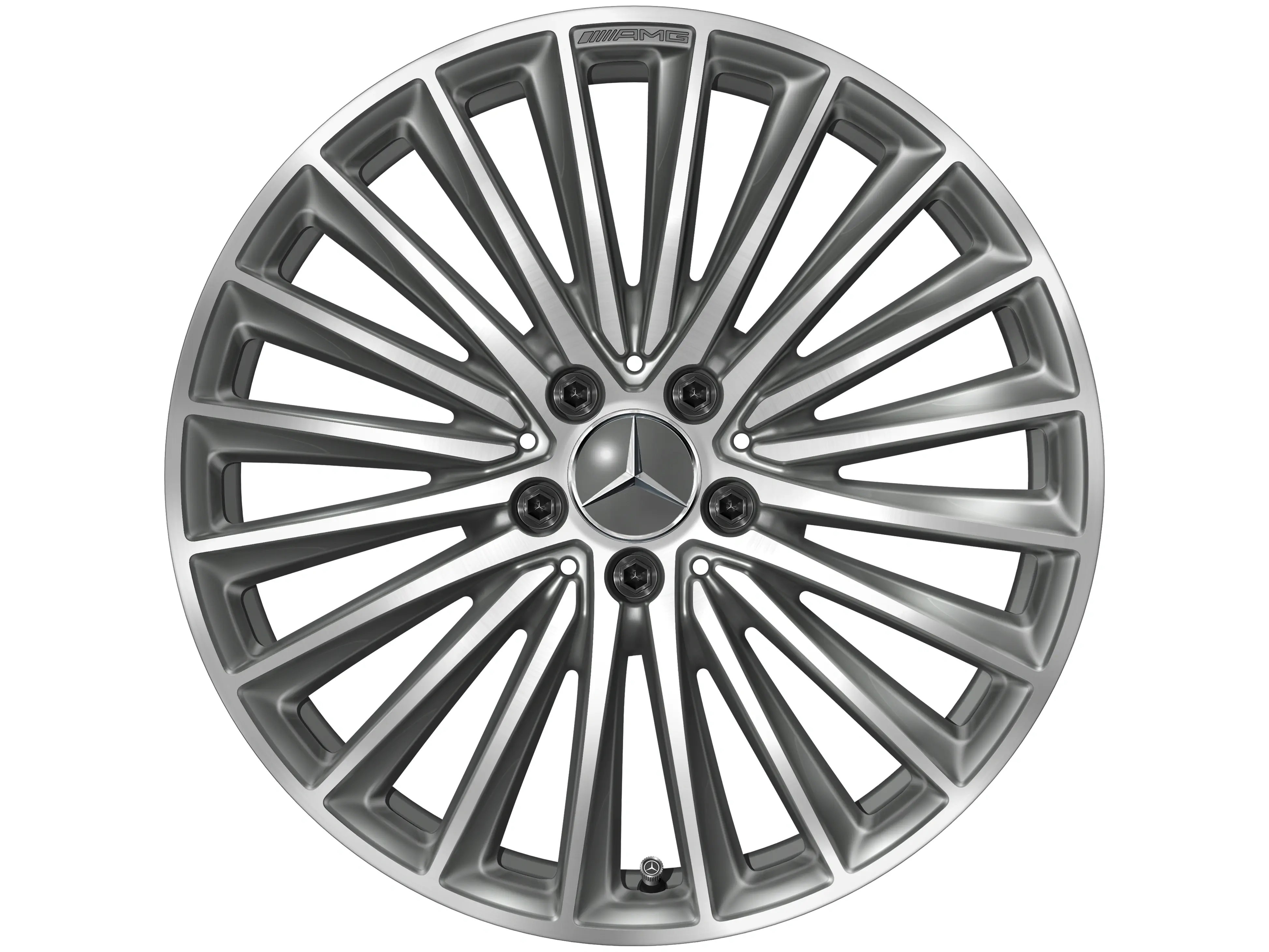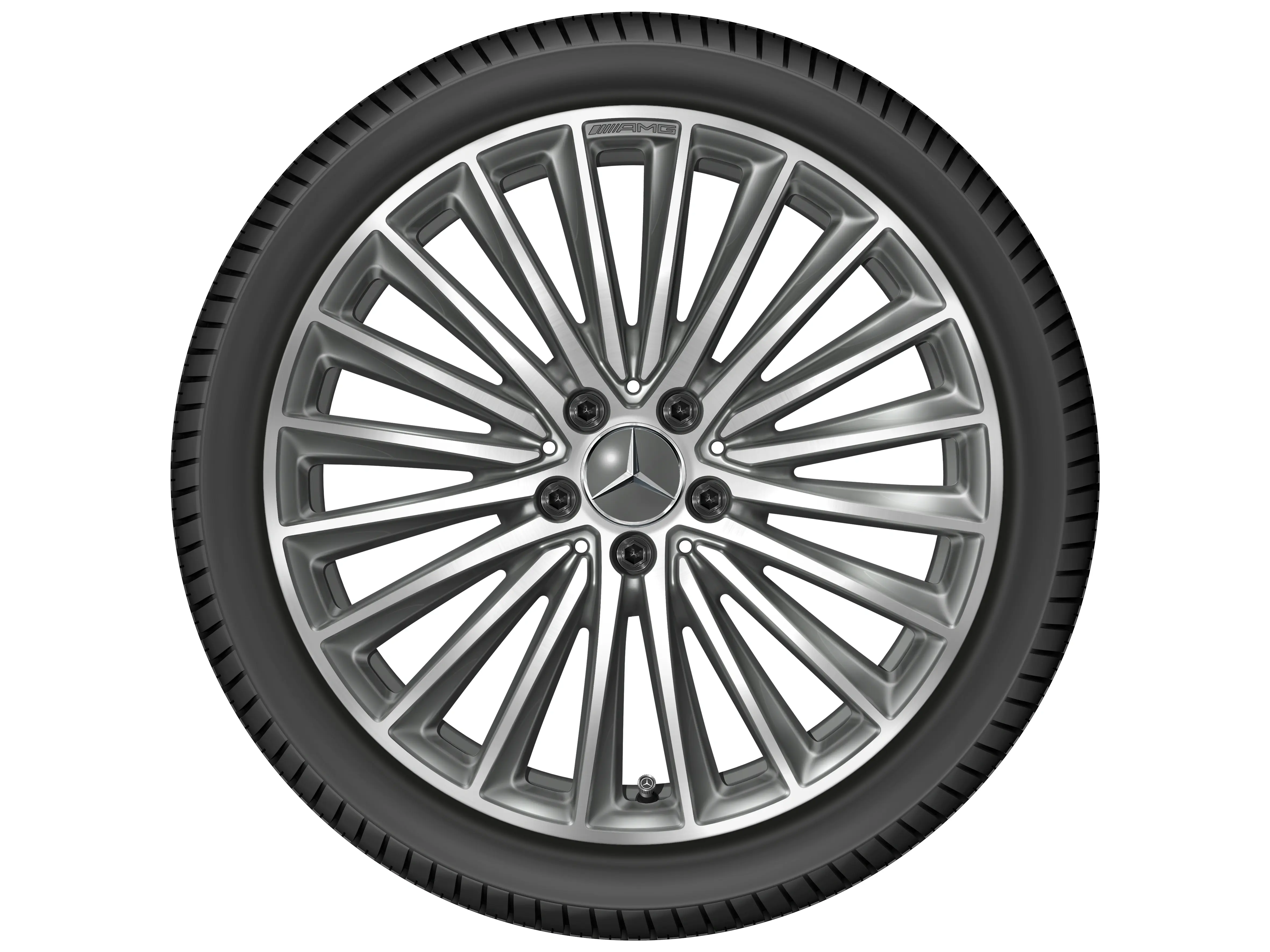AMG Leichtmetallräder werden ohne Reifen, Radnabenabdeckungen, Ventilkappen, Radschrauben und Radsicherungen geliefert.