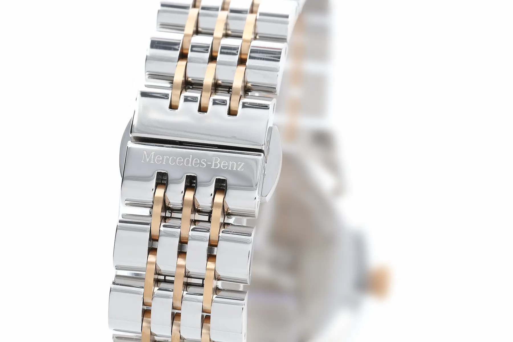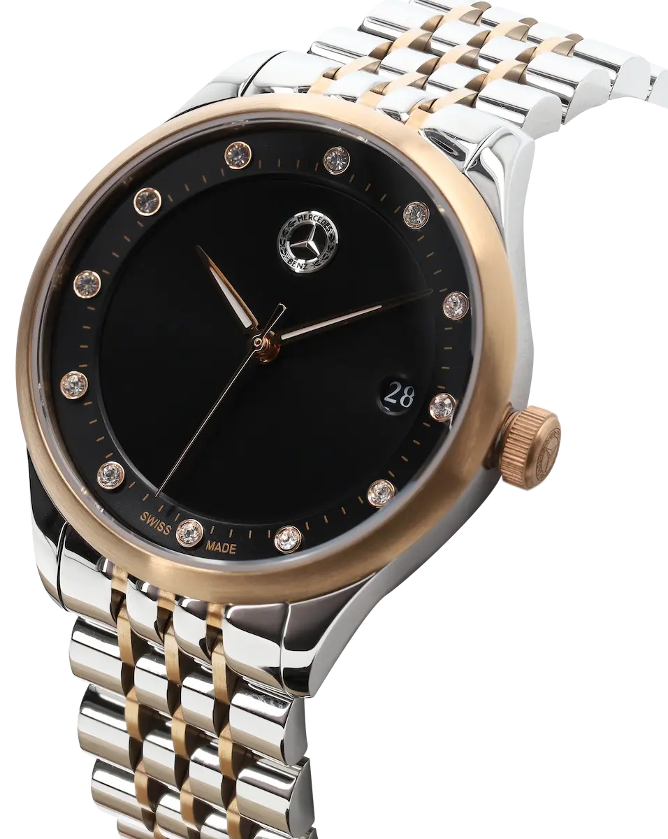 Mit der eleganten Damenuhr mit Schweizer Quarzwerk 505 von Ronda die Zeit immer im Blick: Die Armbanduhr mit poliertem Edelstahlgehäuse und goldfarben abgesetzter und mattierter Lünette ist ein zuverlässiger Begleiter und überzeugt nicht nur durch Funktionalität, sondern auch durch ein überaus ansprechendes Design. So ist das von entspiegeltem und gewölbtem Saphirglas geschützte Zifferblatt in Schwarz gehalten und wird von Indizes aus gefassten Kristallen zusätzlich aufgewertet. Ein Edelstahlband in silber-/goldfarbener Bi-Color-Optik, das sich mit einer eleganten Schmetterlingsfaltschließe sicher am Arm befestigen lässt, rundet die Optik gekonnt ab. Eine Datumsanzeige ist bei 3 Uhr platziert und dank Zeigern mit Leuchtmasse von SuperLumiNova® ist auch in der Dunkelheit ein zuverlässiges Ablesen der Uhrzeit gewährleistet. Auch Feuchtigkeit kann der Damenuhr so schnell nichts anhaben. So ist das elegante Accessoire bis 5 ATM wasserdicht.