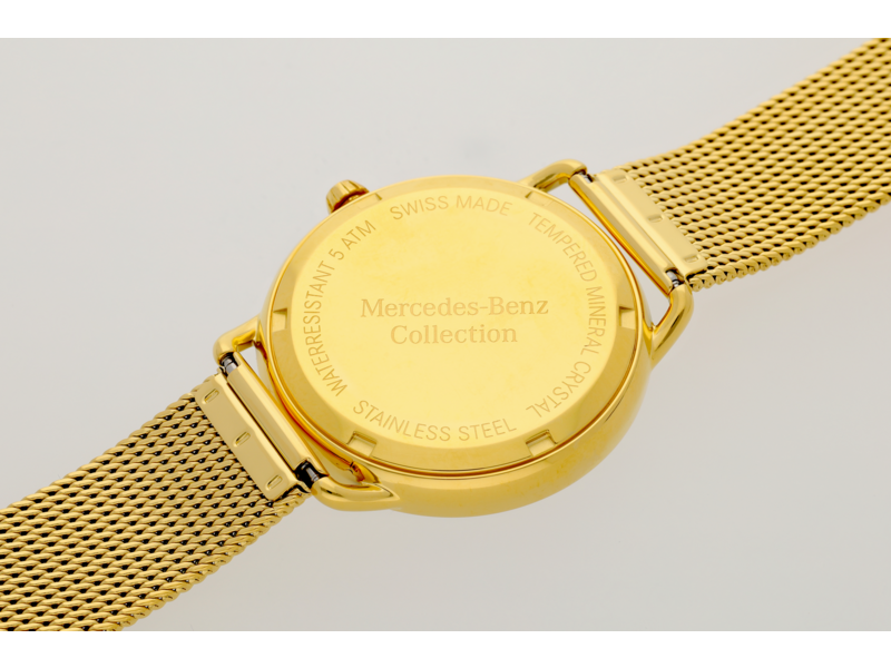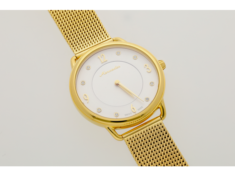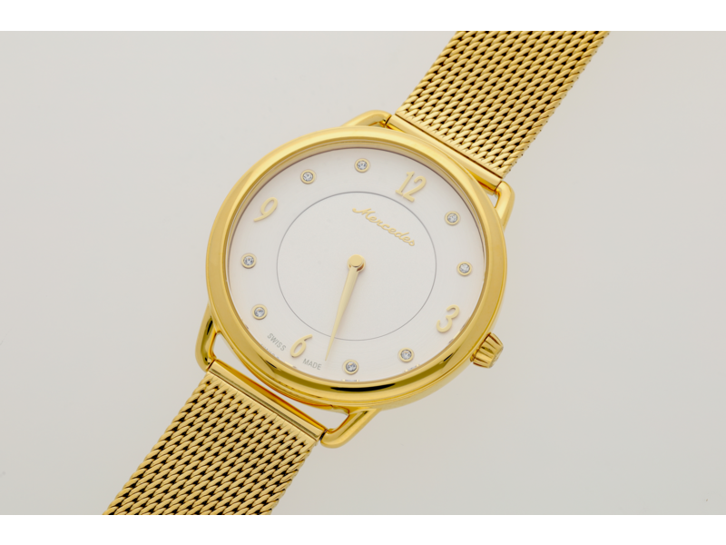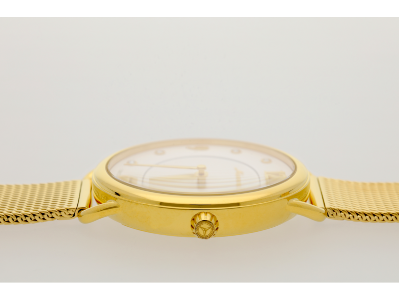 Die Armbanduhr Classic Lady ist ein unverzichtbares Accessoire für modebewusste Damen, die die Zeit immer im Blick behalten wollen. Das Edelstahlgehäuse ist mit einer polierten Oberfläche und einer gelbgoldfarbenen PVD-Beschichtung versehen, um ihr ein klassisch-elegantes Aussehen zu verleihen. Das silberfarbene Zifferblatt ist mit goldfarbenen Zeigern und Ziffern versehen und acht gefasste Kristalle sorgen für einen besonderen Akzent. Die Ziffern und Indexe liegen auf einer zum Zentrum abfallenden Zone, was der Uhr eine hochwertige, dreidimensionale Optik verleiht. Für angenehmen Tragekomfort sorgt ein Milanaise-Geflechtarmband aus Edelstahl mit gelbgoldener PVD-Beschichtung. Diese Uhr ist mit einem hochwertigen Quarzwerk Ronda 1062 ausgestattet und bis zu 5 ATM wasserdicht. Details: Farbe: gelbgoldfarben/silberfarben, Material: Edelstahl, Durchmesser: 36 mm, wasserdicht bis 5 ATM, Quarzwerk Ronda 1062, Swiss made.