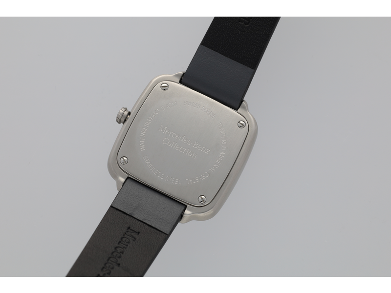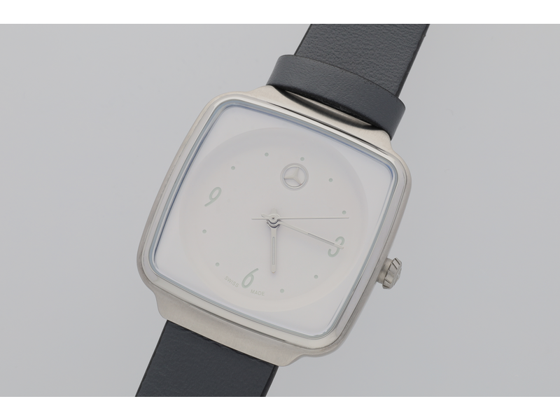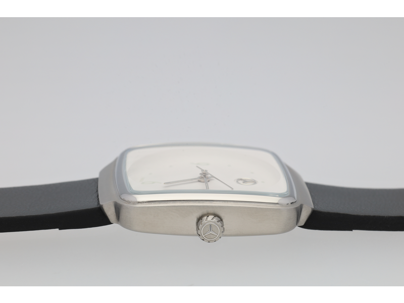 Die Damen-Armbanduhr in modernem Design ist perfekt für die modebewusste Frau von heute. Sie setzt an jedem Handgelenk Akzente und bietet gleichzeitig Funktionalität, sodass die Zeit nie aus dem Blick gerät. Das Formgehäuse der Uhr ist eckig und besteht aus Edelstahl. Das Zifferblatt ist weiß und im Zentrum befindet sich eine deutlich sichtbare Hohlkehle, in der geprägte Ziffern und Indexe mit silberner Farbe ausgelegt sind. Somit ist das Ablesen auch in der Dunkelheit möglich, da die silberfarbenen Zeiger mit Leuchtmasse Super-LumiNova® ausgestattet sind. Ein erhabener Mercedes Stern ist bei 12:00 Uhr platziert, was die Optik der Uhr komplettiert. Ausgestattet ist die Uhr mit einem Quarzwerk Ronda 1063 mit Anzeige von Stunde, Minute und Sekunde. Sie ist bis zu 5 ATM wasserdicht und bietet mit dem anthrazitfarbenen Kalbslederband mit Dornschließe einen angenehmen Tragekomfort. Die Uhr ist Swiss made und ihre Details im Überblick: Farbe: weiß/anthrazit/schwarz, Material: Edelstahl/Kalbsleder, Maße: ca. 31,3 x 35,7 mm, wasserdicht bis 5 ATM, Quarzwerk Ronda 1063.
