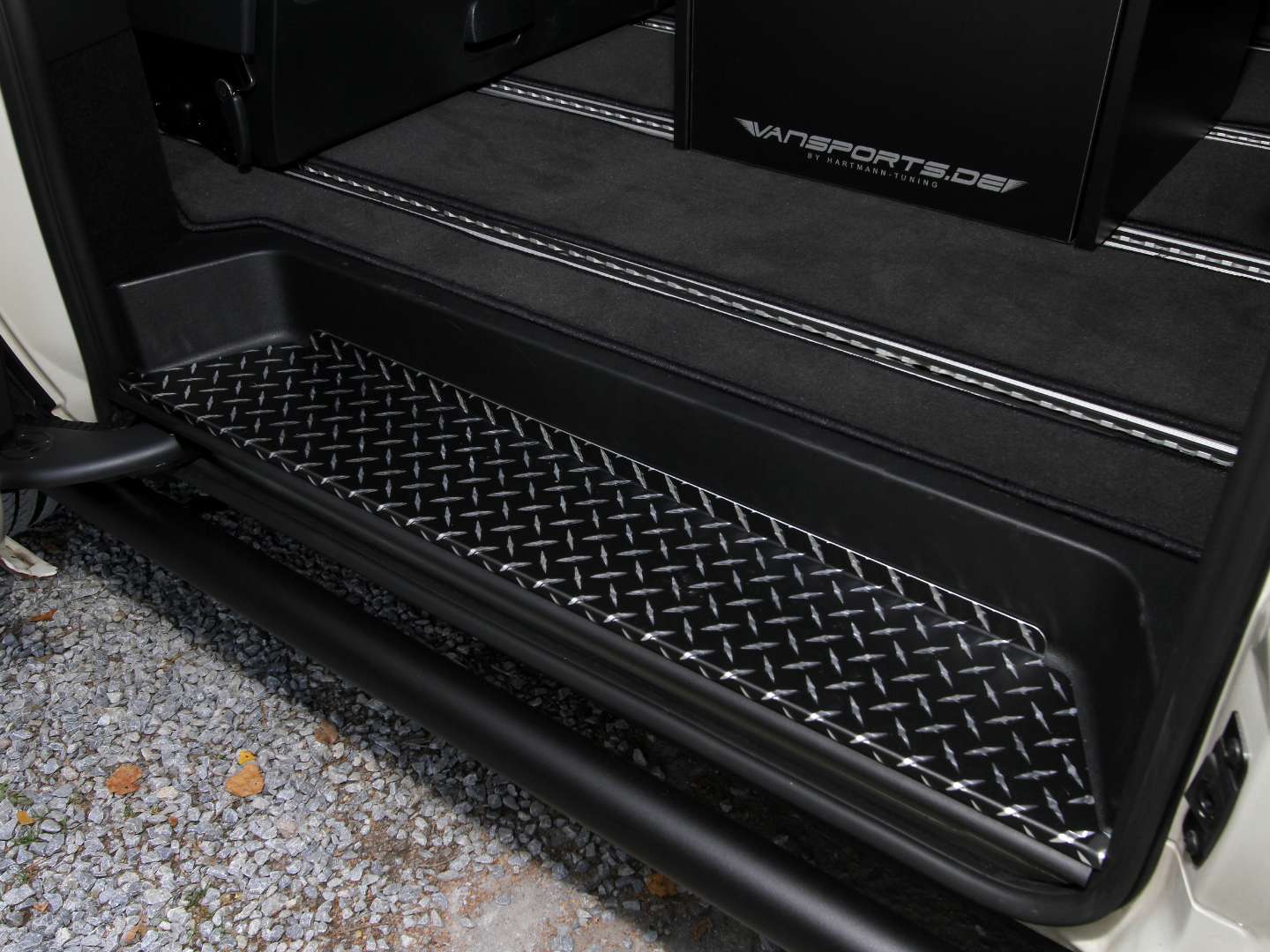 Das 3- oder 4-teilige Einstiegsleisten-Set von VANSPORTS, hergestellt aus Aluminium und mattschwarz pulverbeschichtet, bietet eine rutschfeste Oberfläche dank der überfrästen Details. In dem 4-teiligen Set sind Einstiegsleisten für die Fahrer- und Beifahrertür sowie für die linken und rechten Schiebetüren enthalten.