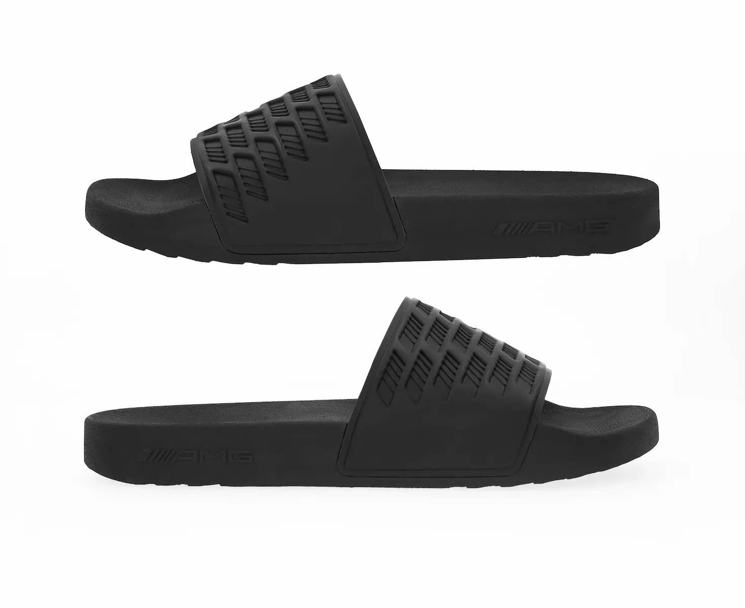 Whether on the beach, at the spa or in the pool, with the AMG bathing slippers you can show your enthusiasm for the Mercedes-AMG brand. These slippers not only impress with their sporty aesthetics, but also offer maximum comfort thanks to a pre-shaped footbed and pleasant, lightweight cushioning. In addition to an AMG 3D logo on the outer edge of the sole and a buckle embossed with the AMG diamond pattern, the slippers also feature a reflected AMG logo on the inside of the shoe sole, which leaves an AMG logo print when wet or on sand. A subtle effect with a big impact.