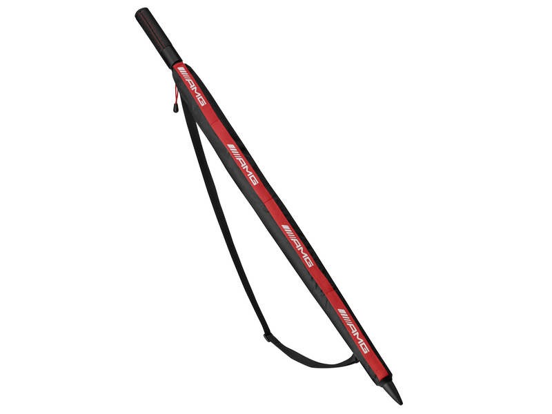 The black and red Mercedes-AMG guest umbrella offers ideal protection when the weather changes. This umbrella is not only functional, but also a real eye-catcher. The pole is in matt black, while the rails and umbrella tips are in red. Black hinges, a black sheath with a decorative AMG logo brand in red with a printed white AMG logo band and a black shoulder strap make the guest umbrella a distinctive design object. The ergonomically shaped handle with soft-feel coating and fine, perforated leather cover echoes the design of the Mercedes-AMG GT, while the silver-colored release button with AMG diamonds enables quick, automatic opening. The sunshade is made of 100% polyester and has a length of 98 cm when closed and a diameter of 156 cm when open.