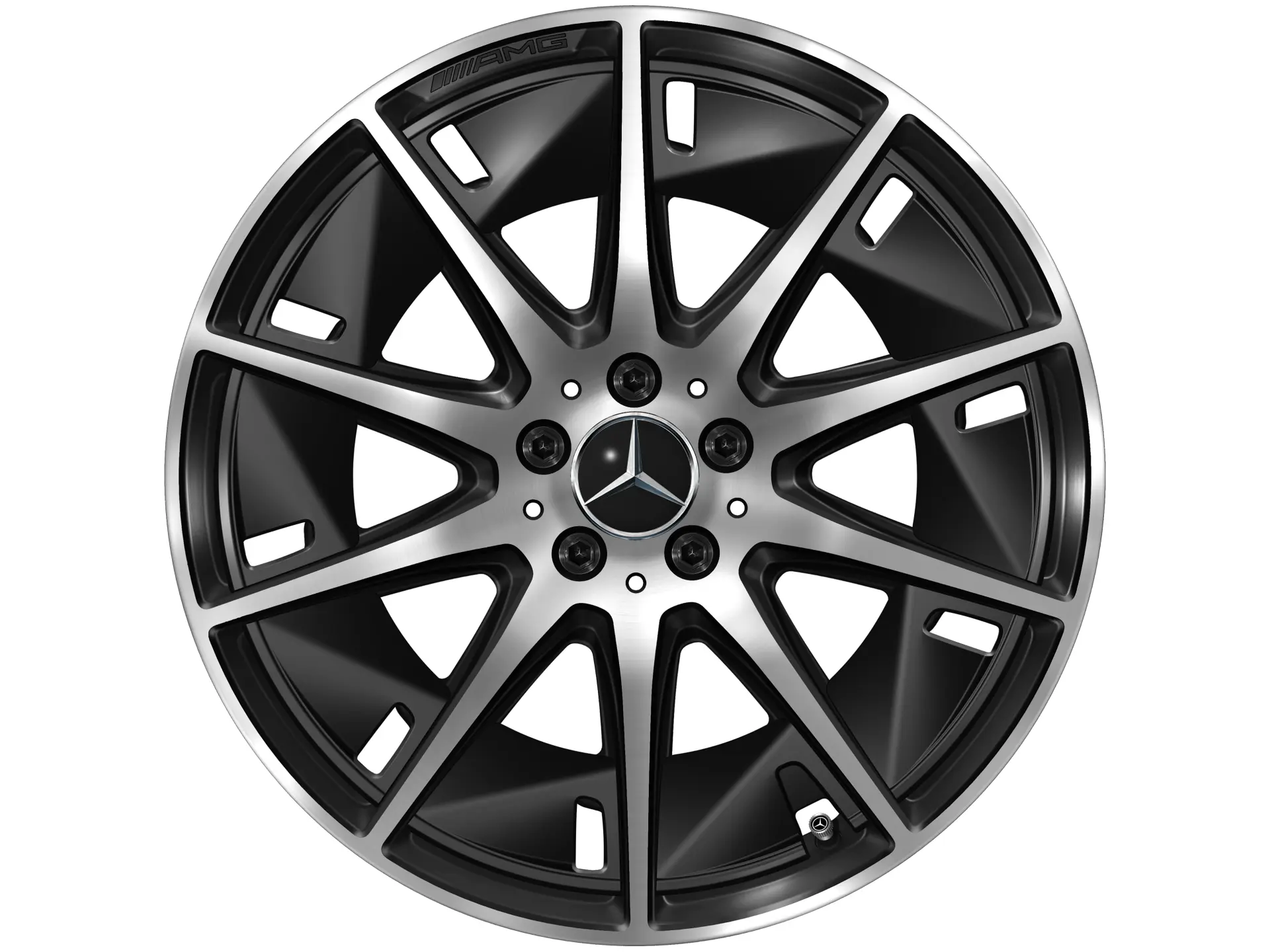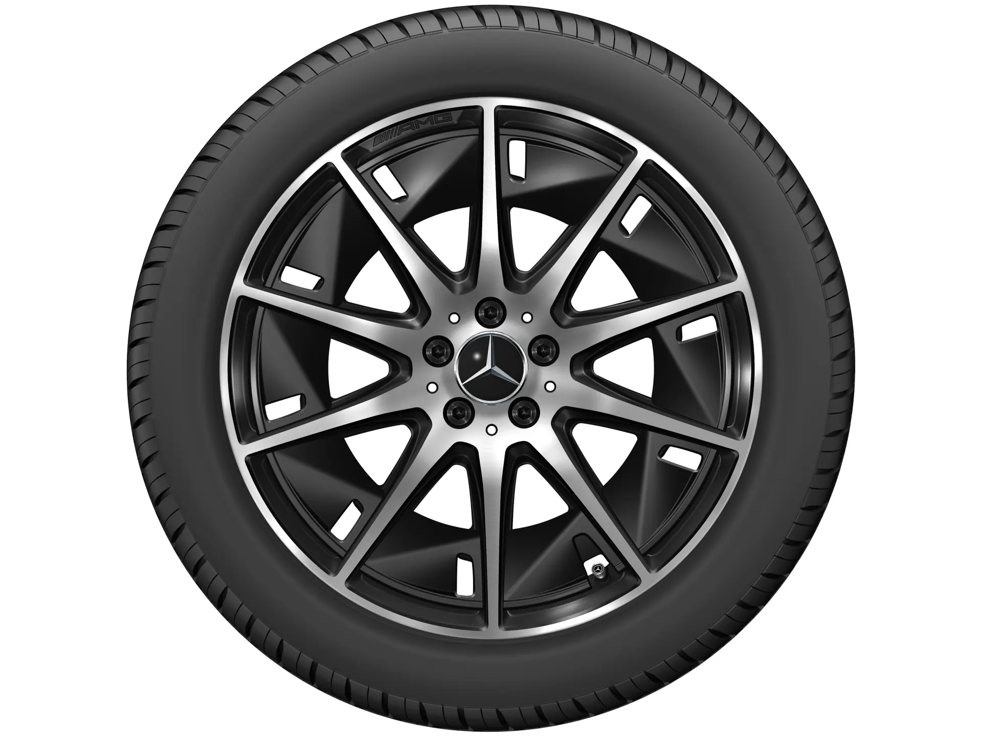 AMG Leichtmetallräder werden ohne Bereifung, Radnabenabdeckungen, Ventilzierkappen, Radschrauben und Radsicherungen ausgeliefert.