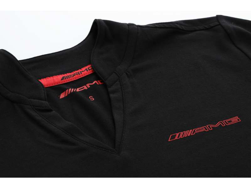 The AMG half-sleeved polo shirt in a black and red design with a stand-up collar and V-neck offers optimum comfort. It has a slim fit and is extremely lightweight, breathable and moisture-wicking. Mesh inserts in the lower side seam create a fashionable look. The printed AMG logo outline on the left chest area and the red neck tape with woven-in black AMG logo make the ladies' polo shirt an ideal companion for sport or leisure. Material: 88% Modal Micro (TENCEL™) from Lenzing / 12% elastane Sizes: XS-XL Collection: Mercedes-AMG Collection NOTES: - Bleach: Do not bleach. - Do not dry clean: Do not dry clean. - Dry: Do not tumble dry. - Ironing: Do not iron hot (110 °C). - Washing: Gentle wash cycle 30 °C, easy care.