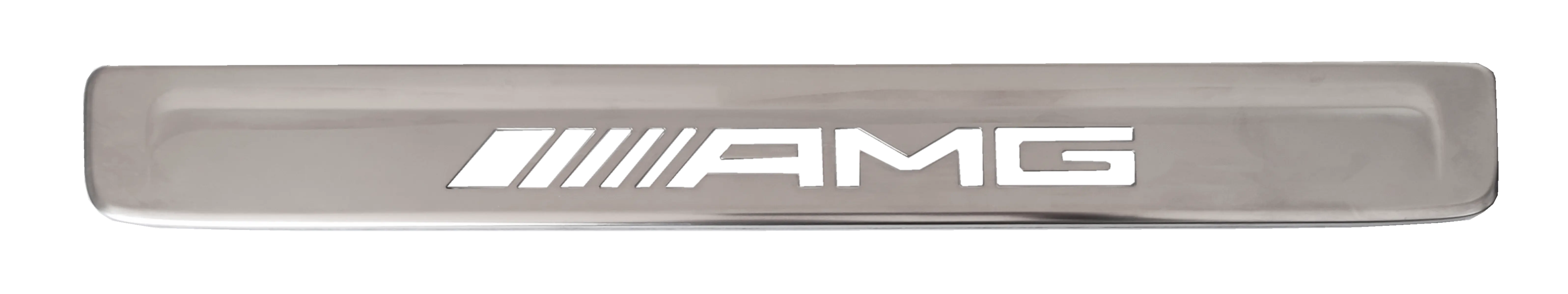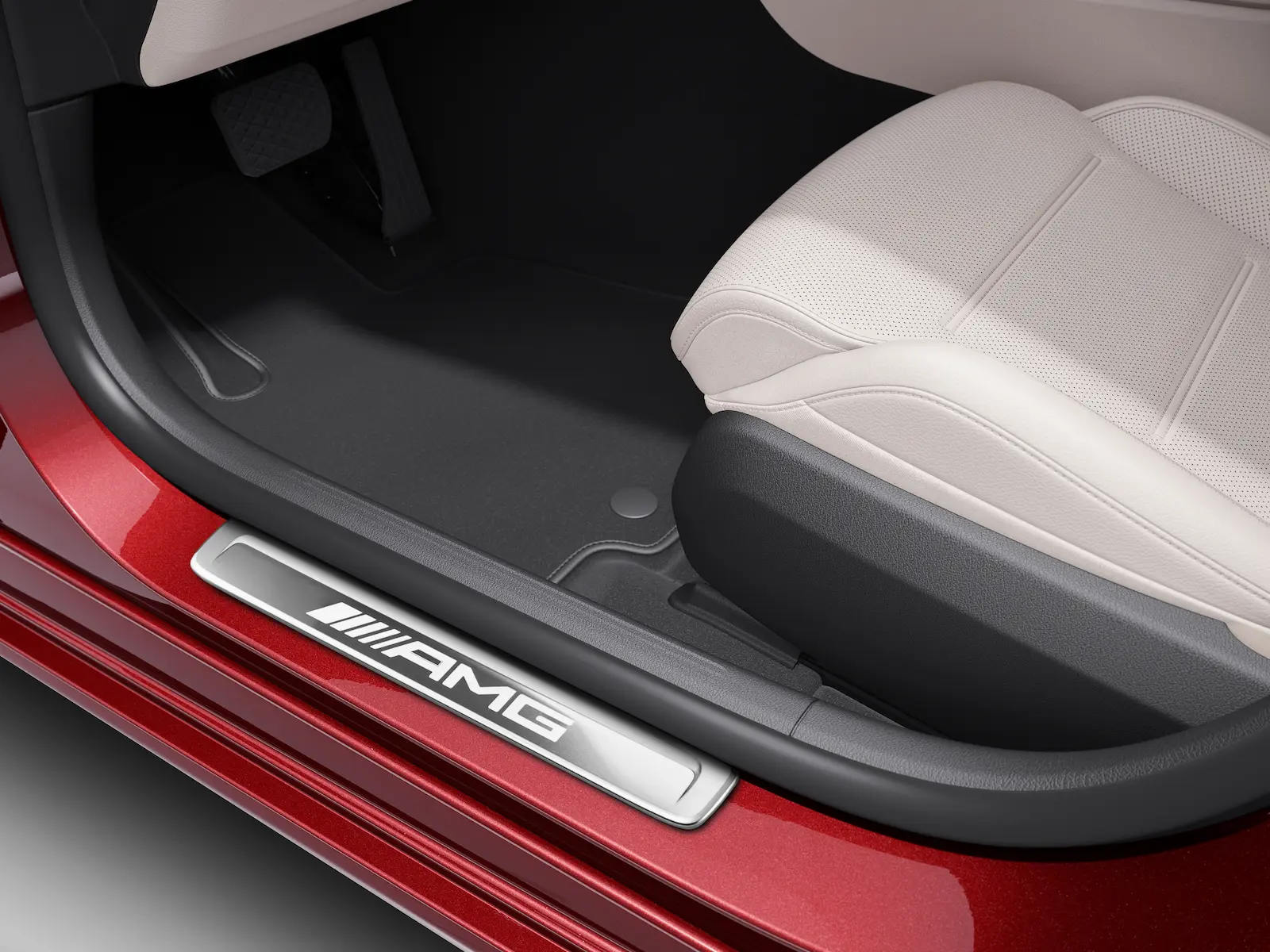 The interchangeable cover in silver with white AMG lettering for the illuminated door sill trim is not only visually appealing, but also helps with orientation in the dark. It is characterized by easy installation, perfect fit and high durability and longevity.