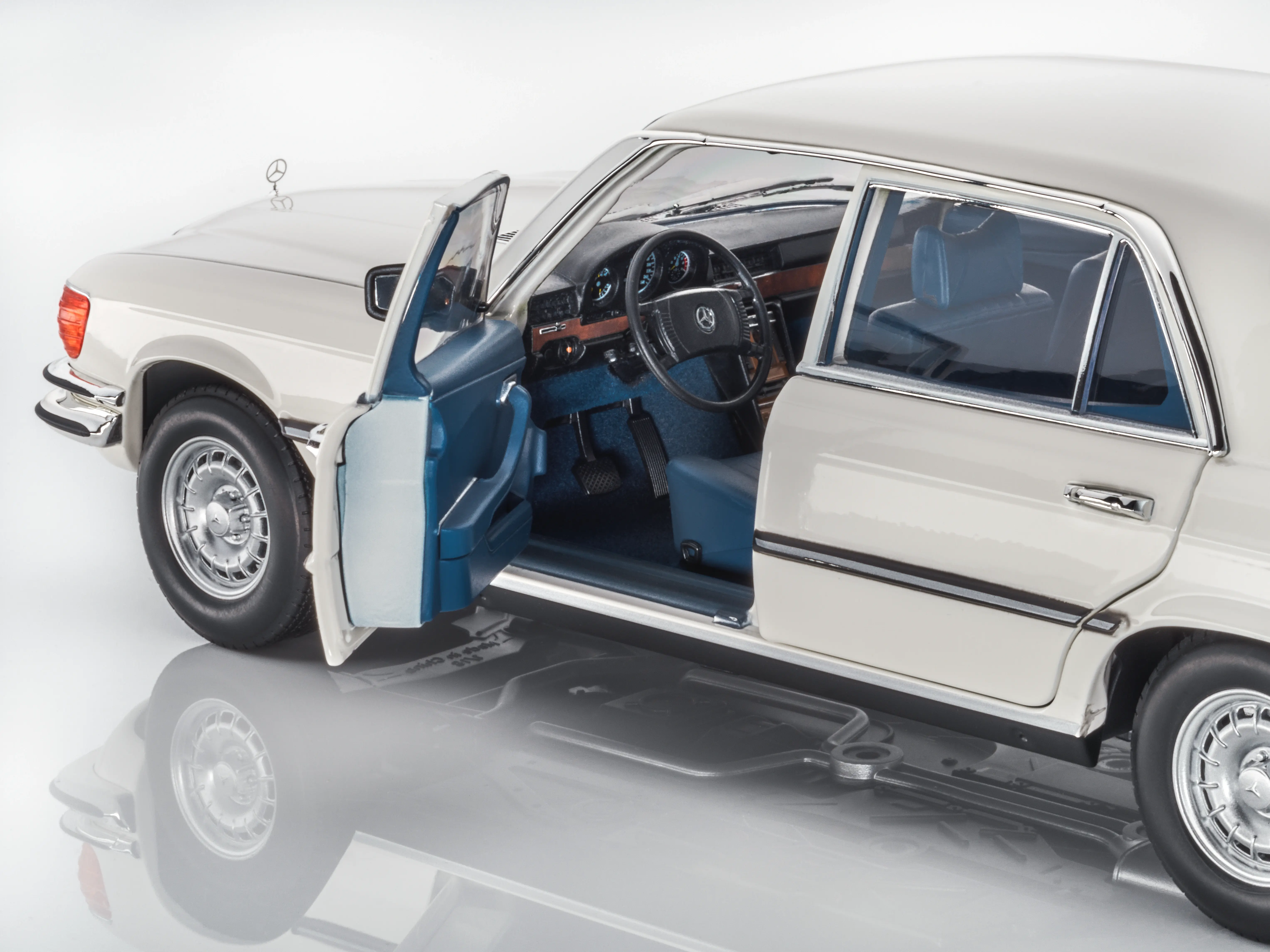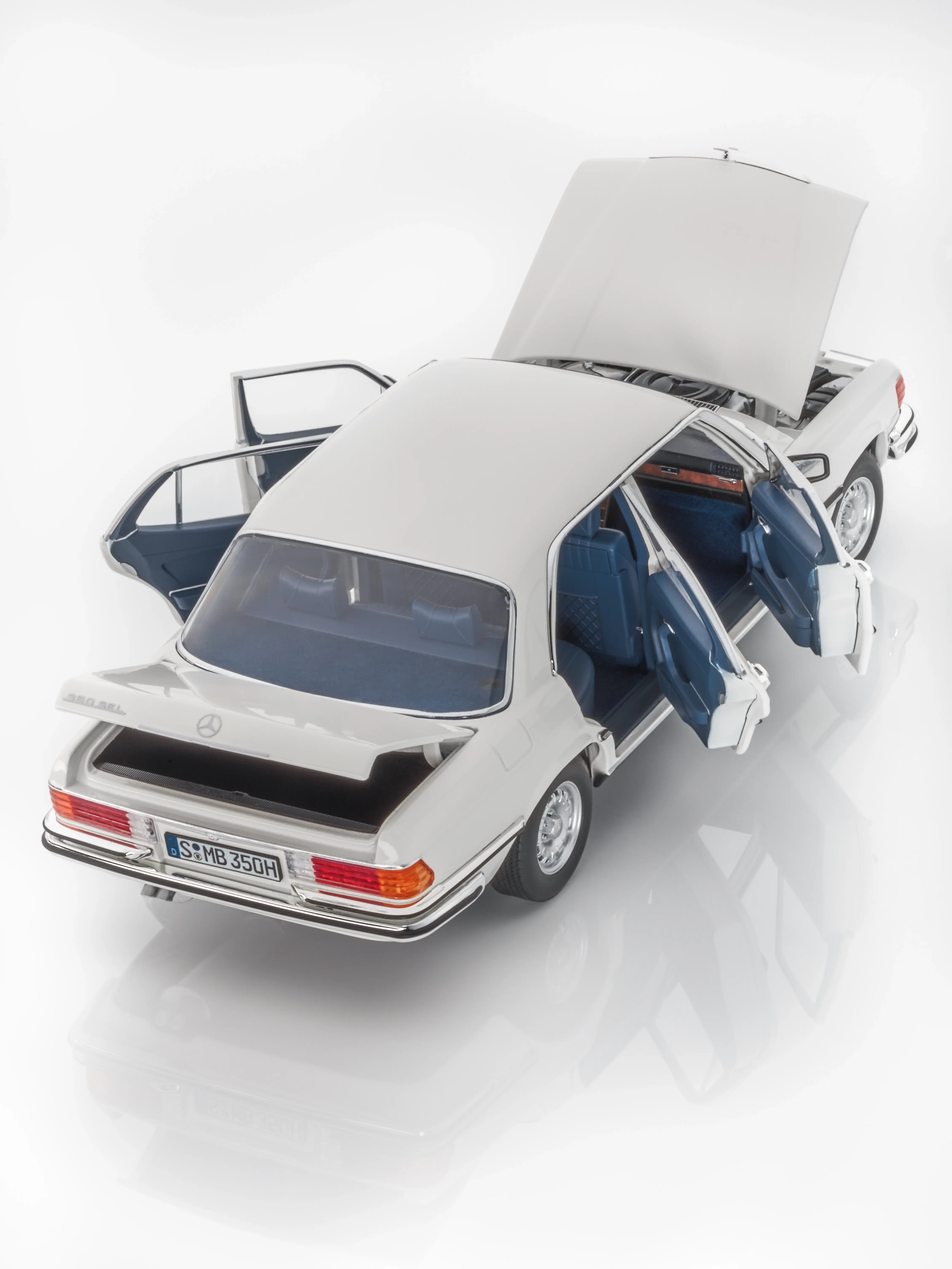 Eine völlig neu entwickelte Fahrzeuggeneration der Oberklasse: Im September 1972 präsentierte Mercedes-Benz der Öffentlichkeit erstmals die ""Mercedes-Benz S-Klasse"" - eine Fahrzeuggeneration, die hinsichtlich der Passiven Sicherheit den Stand der Techhik markierte. Im Mai 1975 wurde der Typ 450 SEL 6.9 als neues Spitzenmodell der Baureihe und legitimer Nachfolger des 300 SEL 6.3 vorgestellt. Leistungsstärke, höchster Komfort und Sonderausstattungen wie Zentralverriegelung, Klimaanlage oder Scheibenwischer-Waschanlage zeichneten das Topmodell aus. Dem original 450 SEL in höchster Detailtreue nachempfunden, zieht das Miniaturmodell in jeder Sammlung die Blicke auf sich. So begeistert das handmontierte Präzisionsmodell nicht nur durch eine Lackierung im authentischen Farbton, sondern auch durch eine detailgetreue Darstellung des Interieurs. Mit Türen, Motorhaube und Heckklappe lassen sich insgesamt sechs Teile am Modellauto öffnen und ermöglichen den Blick ins Innere des Wagens.