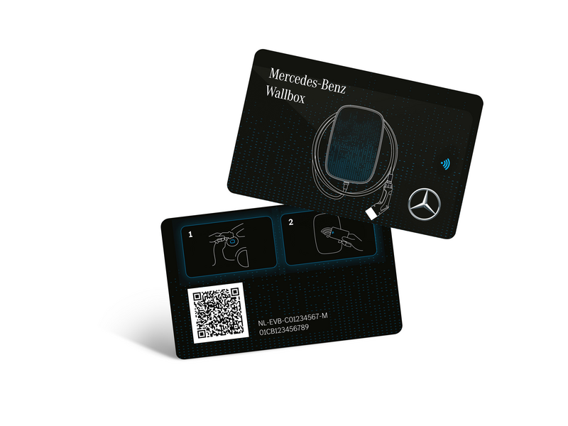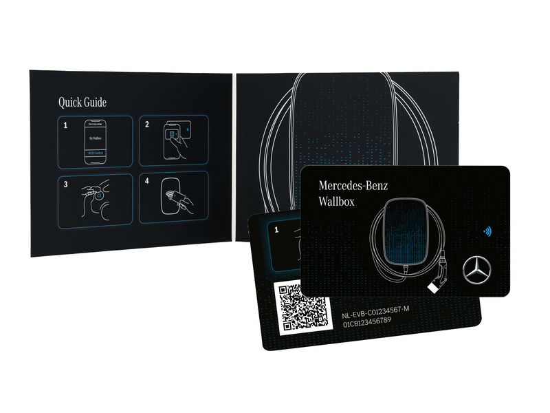 * Up to 10 RFID cards can be connected to one wallbox.** The Mercedes me app, a Mercedes me ID and a Mercedes me contract are required for registration and subsequent use of the RFID card*** From 01.12.2022: When you purchase a Mercedes-Benz Wallbox, you will also receive an RFID card together with your Wallbox.