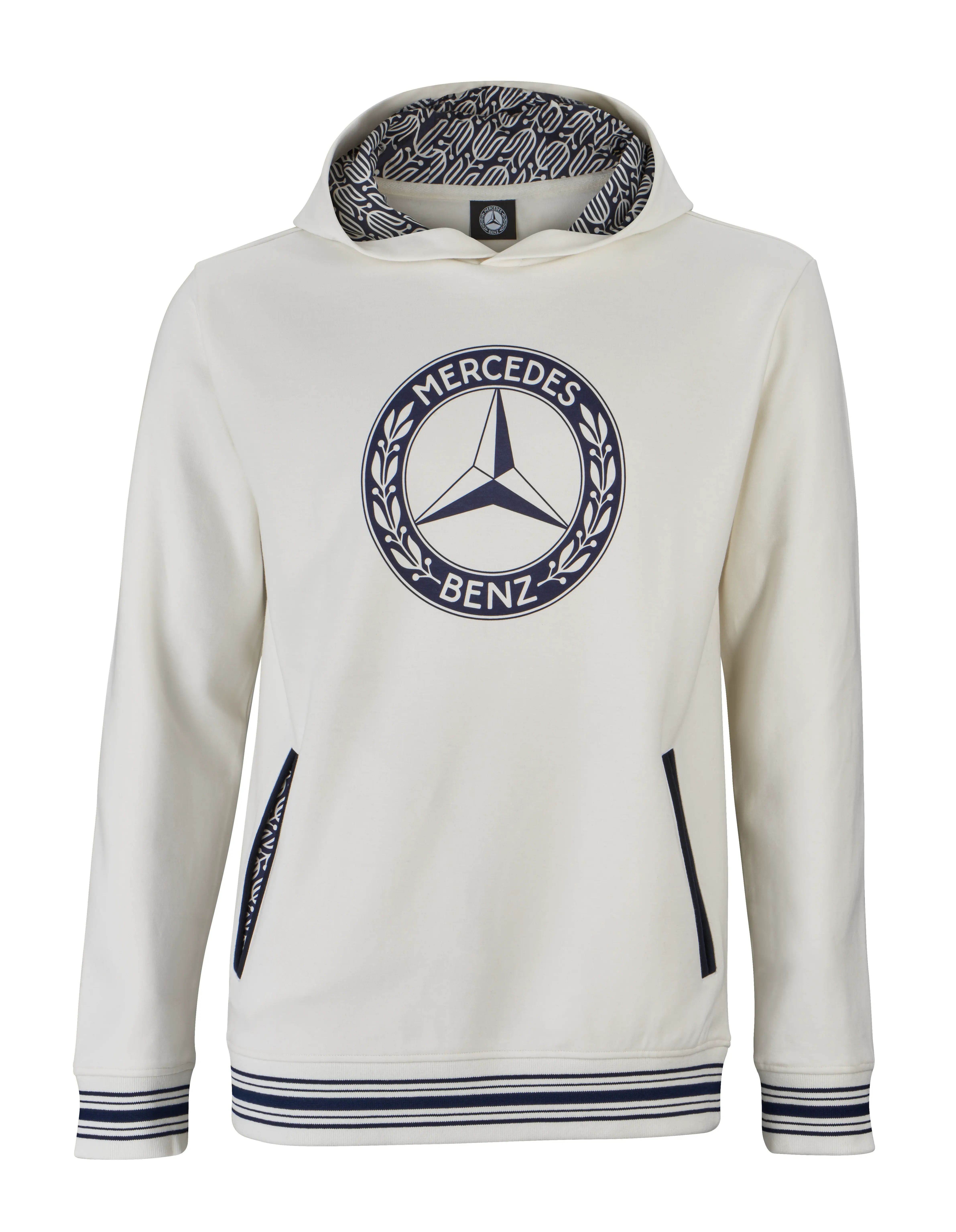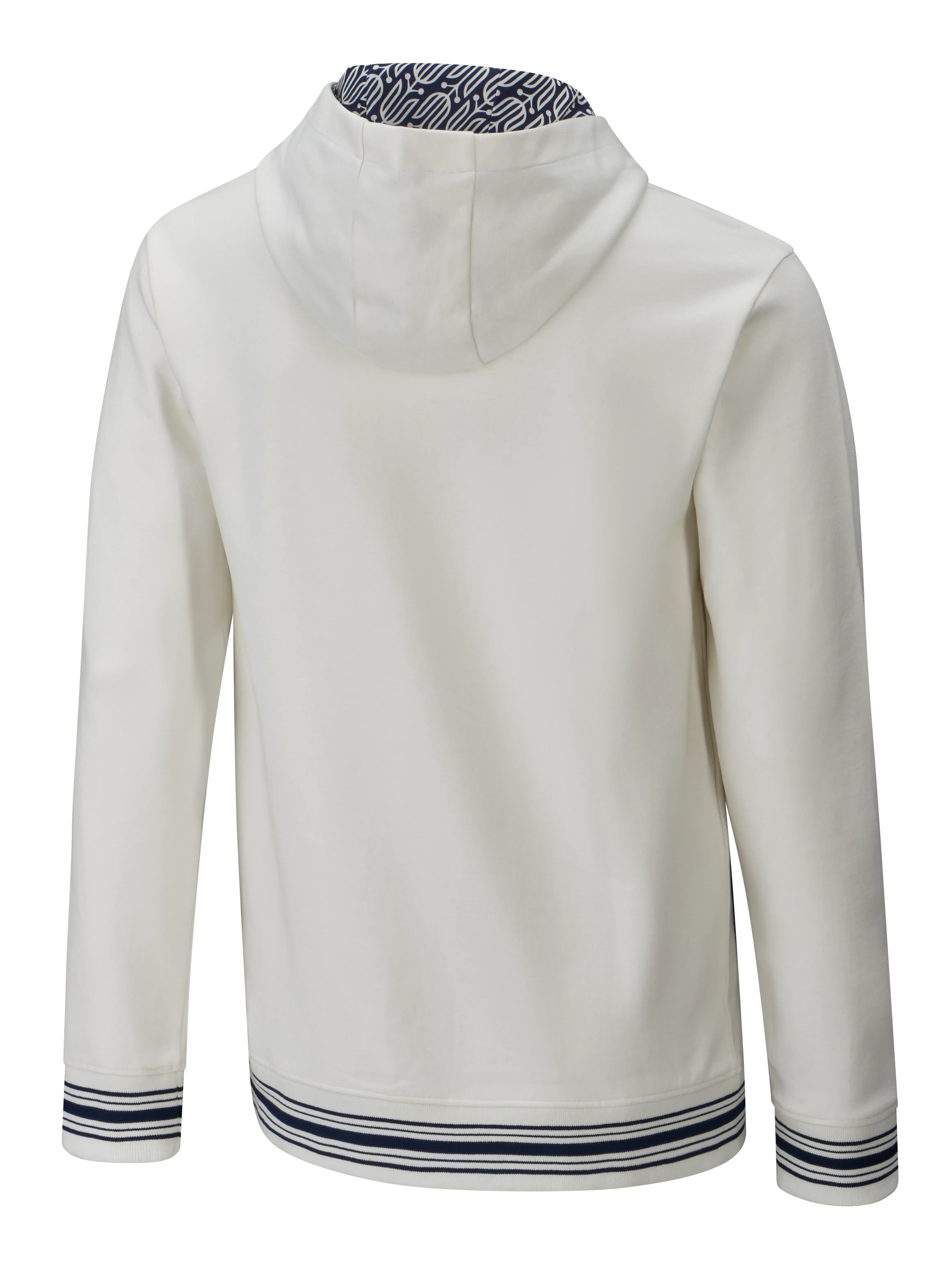 Enjoy cosy comfort on the cooler days of the year with this sweatshirt in off-white and navy. This hoodie in a modern fit style gives you a contemporary casual look for everyday wear and leisure time. The design focuses on small details that make all the difference. The inside of the hood is in navy and decorated with a historic laurel leaf print. The pocket bags are also in navy, as is the inside, which also features a historic laurel leaf print. The neckband is in off-white and the hem and cuffs are designed in a fine 1 x 1 rib with knitted-in navy stripes. A historic star print on the front rounds off the sporty, casual look.
