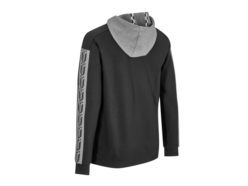 The hoodie from the Mercedes-Benz Classic Collection in a modern fit is a perfect choice when the temperatures drop. The cropped hood with drawstring and continuous black cord and the red neck tape with woven-in black laurel leaves make the look particularly sporty. This is complemented by a black laurel leaf print on both sleeves. The hoodie's eyelets are gunmetal in color, while the stitched bands come in black and white. A woven and embroidered badge with the historic star in the chest area skilfully rounds off the look. The hoodie is available in sizes S-XXL for men and women and is made from 79% polyester/16% viscose/5% elastane (gray melange) or 77% polyester/15% cotton/8% elastane (black).