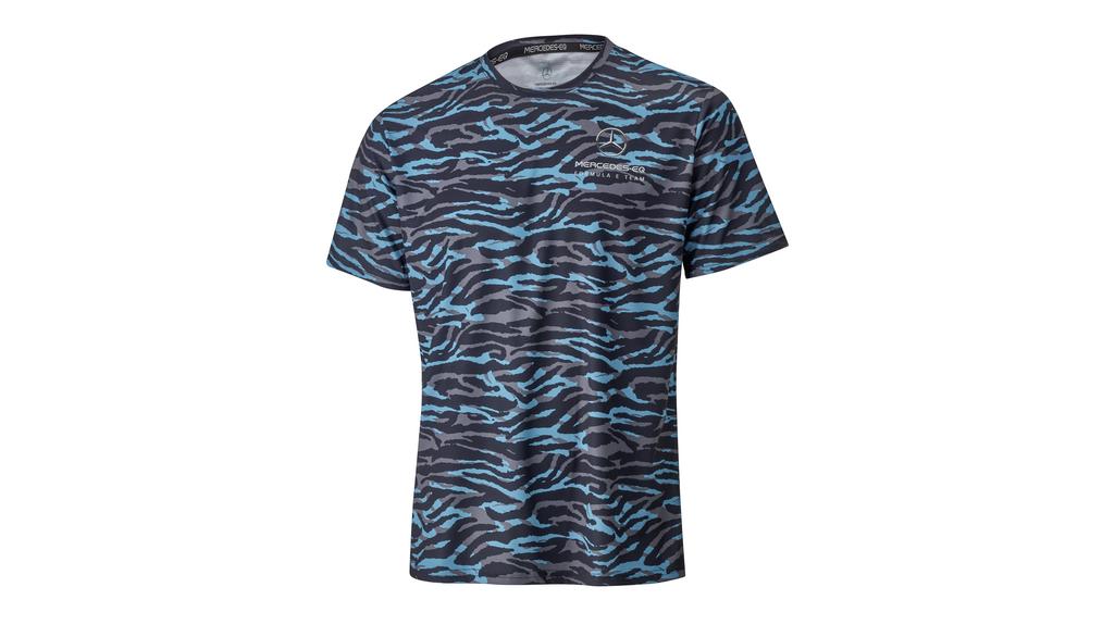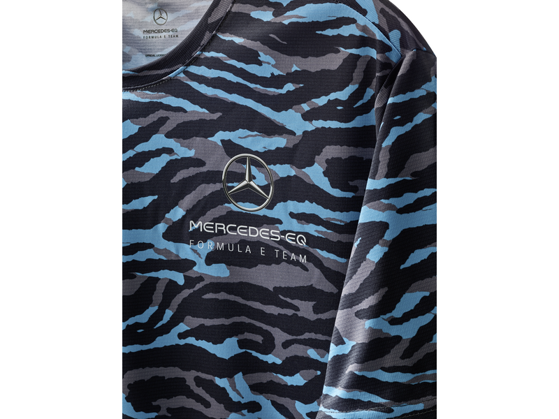 The Mercedes-EQ Formula E Team is bringing electromobility to the world's major cities and the T-shirt allows you to show your enthusiasm for e-racing. It is made from 100% recycled polyester and is available in sizes S to XXL. The regular fit half-sleeved shirt features a camouflage design and a Mercedes-EQ FORMULA E TEAM logo. It is normally washable at 30 °C and should not be ironed, bleached or dry-cleaned. It is not a safety-relevant product.