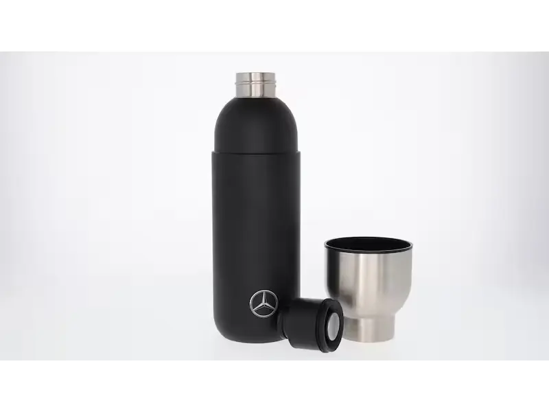 Whether coffee, tea or cold drinks: with the vacuum flask made of double-walled stainless steel with a black powder coating, you can always enjoy still drinks at the perfect temperature. The bottle has a capacity of approx. 0.75 l and keeps drinks hot for up to 24 hours and cold for up to 48 hours. It is equipped with a removable lid that can be used as a cup. A click closure makes pouring easy. After use, the bottle with the engraved Mercedes star can be easily cleaned by hand. Make a contribution to reducing disposable bottles - with the stylish stainless steel vacuum flask.