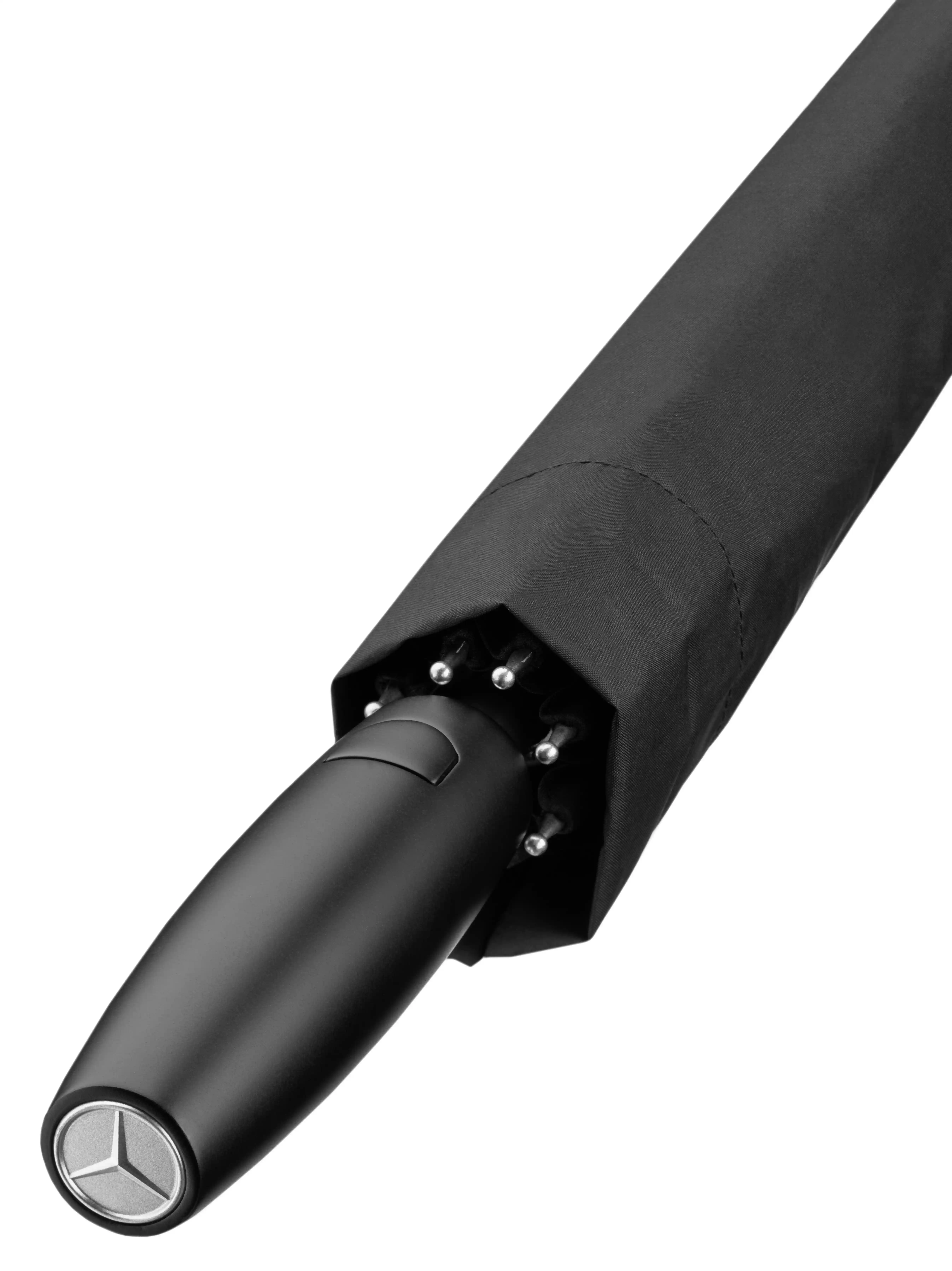 Der schwarze Gästeschirm als idealer Begleiter an regnerischen Tagen. Der 8-teilige Schirm verfügt über einen angenehmen Kunststoffgriff in ikonischem Design und einen Ventilationsbezug aus strapazierfähigem Polyester (recycelt). Für das Plus an Komfort öffnet sich der Schirm mit 14 mm Aluminiumstock automatisch mithilfe der schwarzen Auslösetaste, während er mit seiner „windproof“-Ausführung für mehr Stabilität bei Windböen sorgt. Darüber hinaus ist der Gästeschirm mit einem passenden Futteral sowie Nickelspitzen ausgestattet. Das elegante Design wird durch eine eingesetzte 3D-Sternplakette aus Kunststoff an der Stirnseite des Schirmgriffs sowie einem weißen Mercedes Stern-Druck abgerundet.