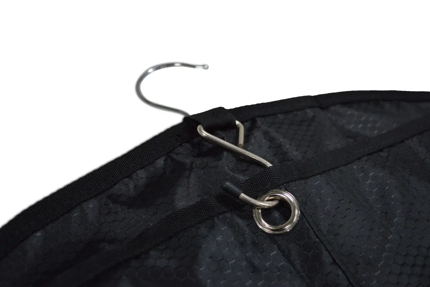 - Die Unterseite des Kleidersacks hat ein extra Auge, sodass er gefaltet aufgehängt werden kann.