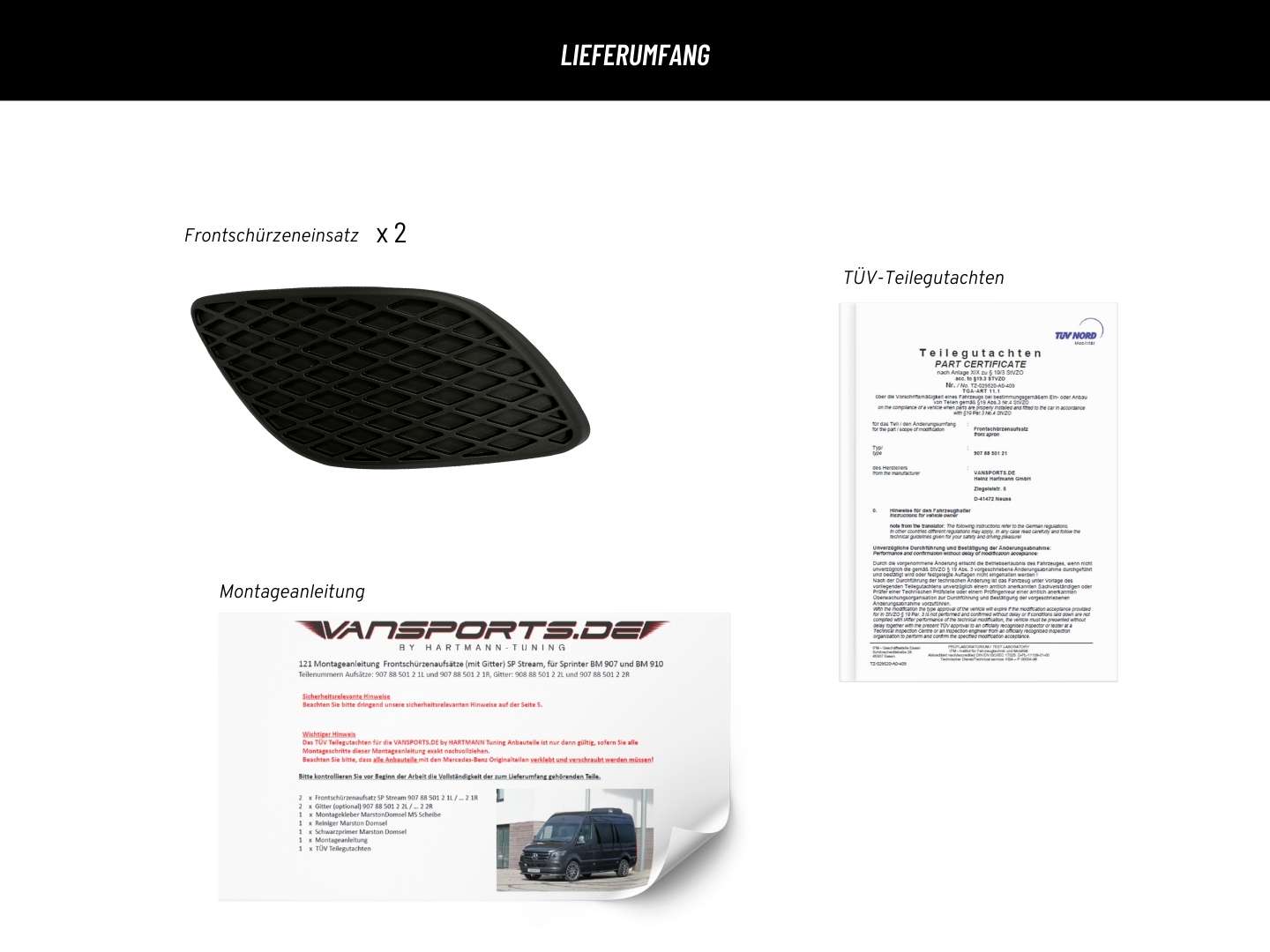 SP STREAM Gittereinsätze (links und rechts) für Autos ohne Nebelscheinwerfer Die "Gittereinsätze" von PUR sind für die Klebemontage in den Frontschürzenaufsätzen [BM 907 / 910] ab dem Baujahr 06/2018 konzipiert. Im Lieferumfang enthalten sind das Montagematerial, ein TÜV Teilegutachten und eine Montageanleitung. Die Montage ist durch Verkleben einfach und dauert etwa 30 Minuten.
