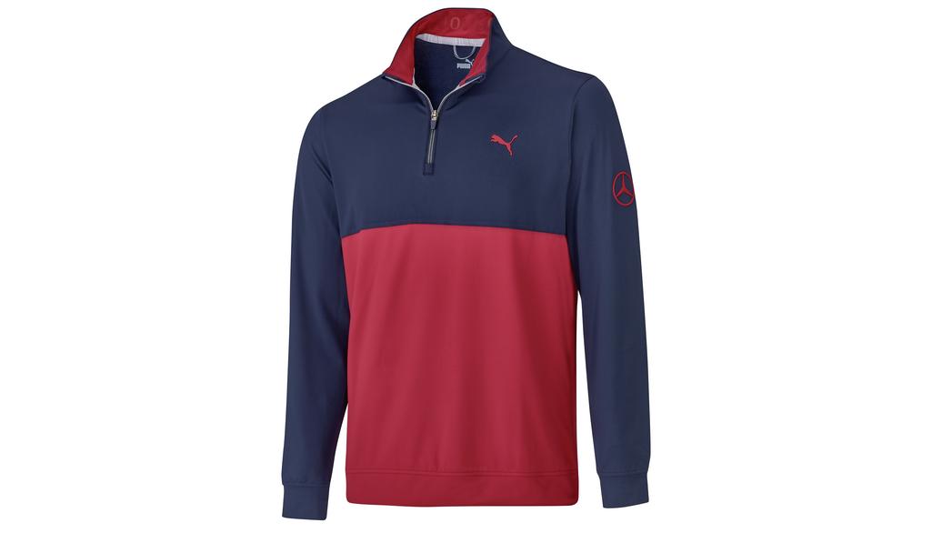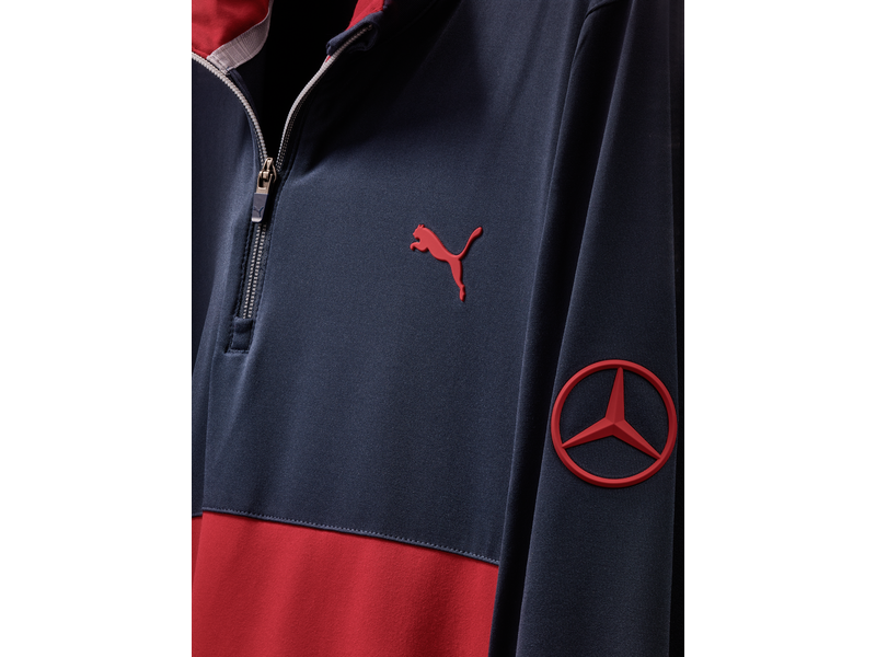 Der Golf-Sweater für Herren aus Polyester und Elasthan ist ein einzigartiger Sweater, der einen stilvollen Auftritt auf dem Golfplatz und Schutz an kalten Tagen bietet. Der Sweater ist in den Farben Navy und Rot designt und verfügt über einen kleinen Stehkragen mit 1/4 Reißverschluss, sowie einen Mercedes Stern auf dem Arm. Er ist Teil der Mercedes-Benz Collection und wird von PUMA hergestellt. Er ist in den Größen S-XXL erhältlich und kann bei 30°C im Schonwaschgang gereinigt werden. Bleichen und Bügeln sollte unterlassen werden, ebenso das Trocknen im Wäschetrockner.