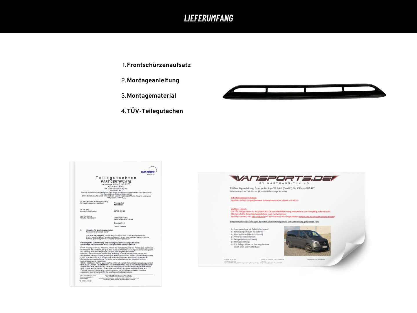 L'attacco per la griglia della grembiulatura anteriore Vansports in plastica ABS da montare sulla grembiulatura anteriore originale della Classe V è adatto solo per i veicoli a partire dall'anno di modello 2019 senza il pacchetto ottico AMG. La fornitura comprende un certificato TÜV per i ricambi. Attenzione! Secondo il certificato TÜV, il montaggio è consentito solo in combinazione con le sospensioni sportive di serie o con un kit di molle ribassate. (Si tratta di una misura di protezione dei pedoni).