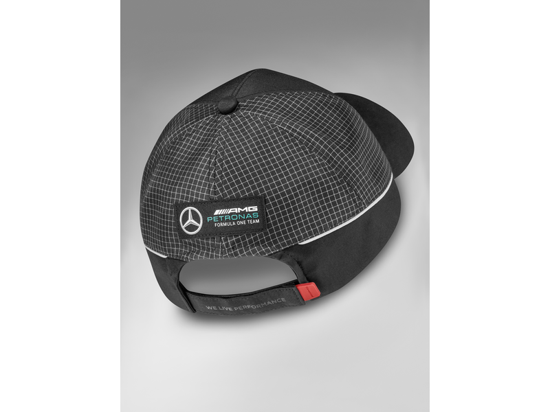 Mostrate al vostro cuore sportivo per chi batte con il cappellino ufficiale della squadra per la stagione 2022 di Formula 1. Questo elegante cappellino da baseball è decorato con una stella Mercedes ricamata sul davanti e il logo MERCEDES-AMG PETRONAS FORMULA ONE TEAM stampato sul lato per un design di successo. Realizzato in poliestere riciclato al 100%, il cappellino è sempre comodo da indossare grazie alla regolazione individuale della taglia. Il tocco finale è dato dalla visiera a sandwich color argento.