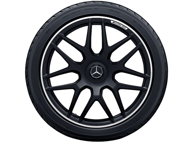 È progettata in modo ideale per le condizioni stradali invernali. Il cerchio è costituito da una ruota forgiata AMG con design a razze incrociate in nero opaco e flangia del cerchio in alluminio lucidato.