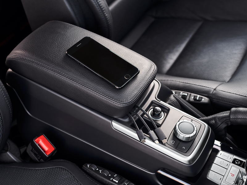 Controllate il vostro iPhone® o altri dispositivi con connessione micro USB o USB tipo C comodamente dal volante multifunzione o dall'impianto audio. Visualizzate i brani musicali, gli artisti o le cartelle di file selezionati nel quadro strumenti o sul monitor dell'impianto audio. Ricaricate contemporaneamente il vostro dispositivo tramite l'interfaccia universale nella console centrale. Con un cavo lungo 1 metro, potrete collegare il vostro dispositivo in modo semplice e comodo. Ulteriori informazioni sono disponibili sul sito www.mercedes-benz.com/connect. Questo prodotto è adatto all'iPhone® (connettore Apple Lightning) e ad altri dispositivi con connessione micro USB o USB tipo C. Il collegamento si trova nella console centrale. Nei veicoli con sistema di intrattenimento posteriore (codice 864/P46), il collegamento può essere effettuato in alternativa nel bracciolo centrale del sedile posteriore. I componenti della NTG4.5 non sono generalmente compatibili con la NTG5 e viceversa. Le funzioni video sono disponibili solo nei veicoli con COMAND Online. Non è possibile trasferire immagini o video da dispositivi Apple.