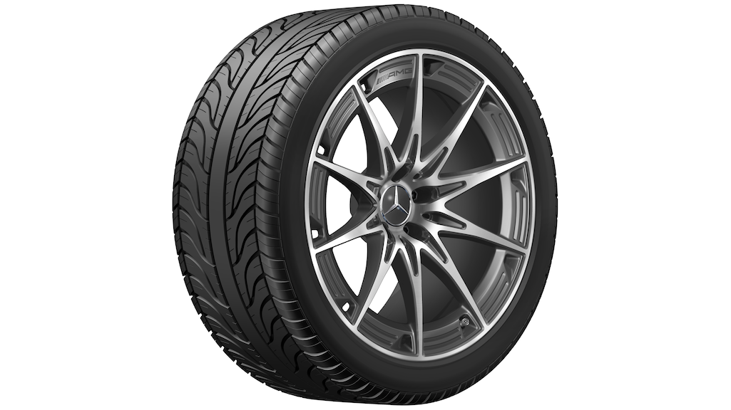 Questa ruota completa è dotata di un cerchio multirazze AMG in grigio tantalio, lucidato e realizzato in alluminio.