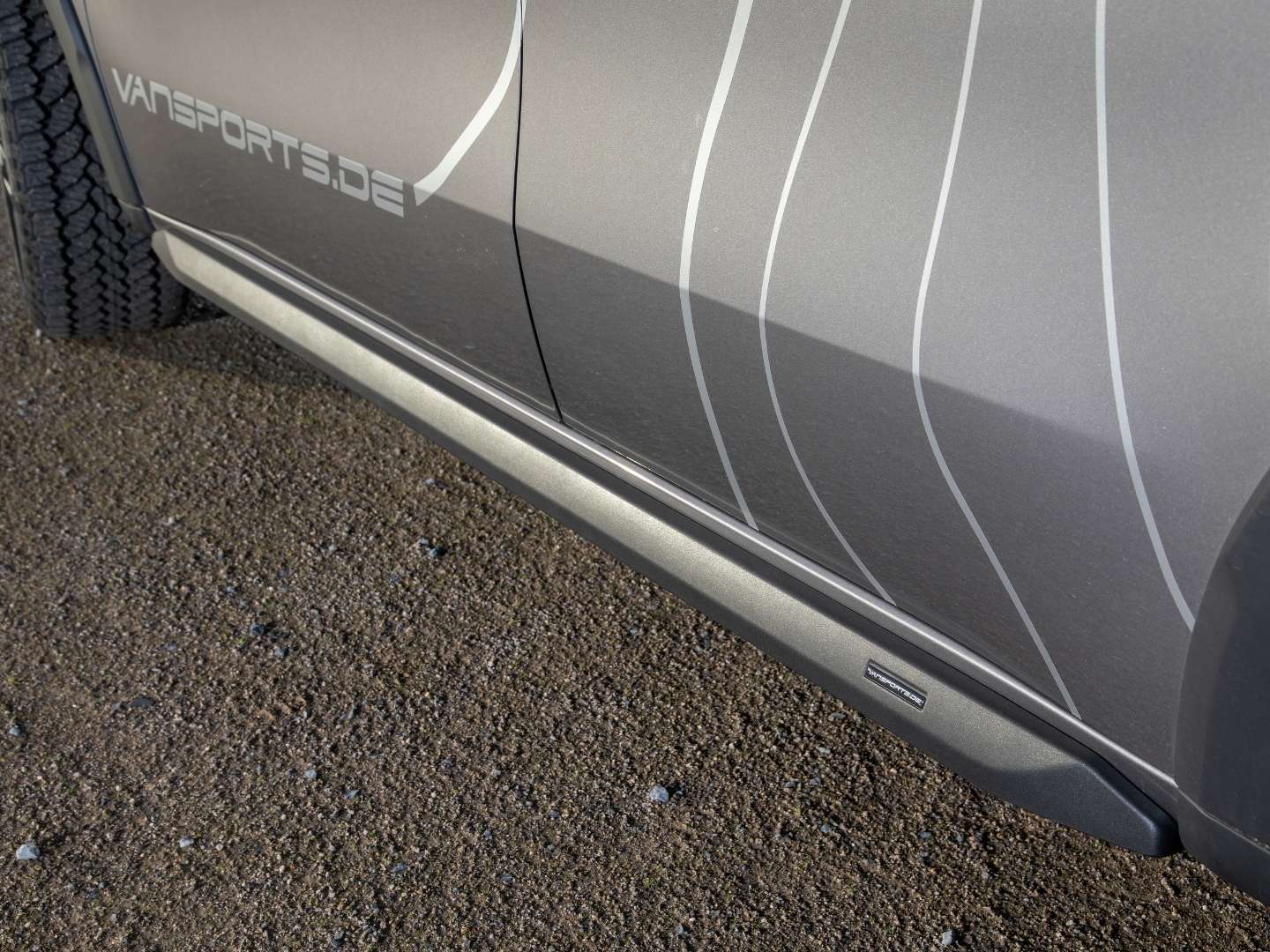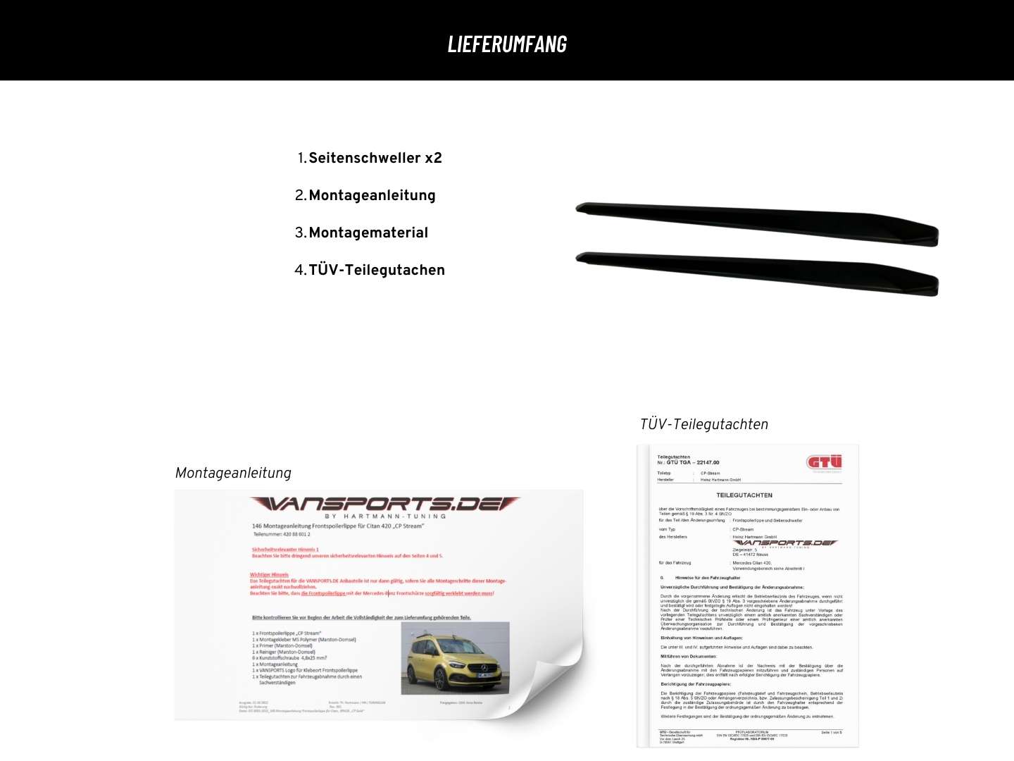 Le minigonne laterali "CP Stream" di VANSPORTS sono state sviluppate appositamente per i modelli 420 Citan e Classe T di Mercedes-Benz. Queste minigonne laterali in PU-Rim sono progettate per il montaggio sotto le minigonne laterali originali e possono essere fissate al veicolo senza forare. La fornitura comprende istruzioni dettagliate per il montaggio, materiale per il montaggio e un certificato di montaggio ai sensi del § 19 (3) n. 4 StVZO per il montaggio di parti del veicolo. Le minigonne laterali sono fornite in "plastica nera" e devono essere verniciate prima dell'installazione.