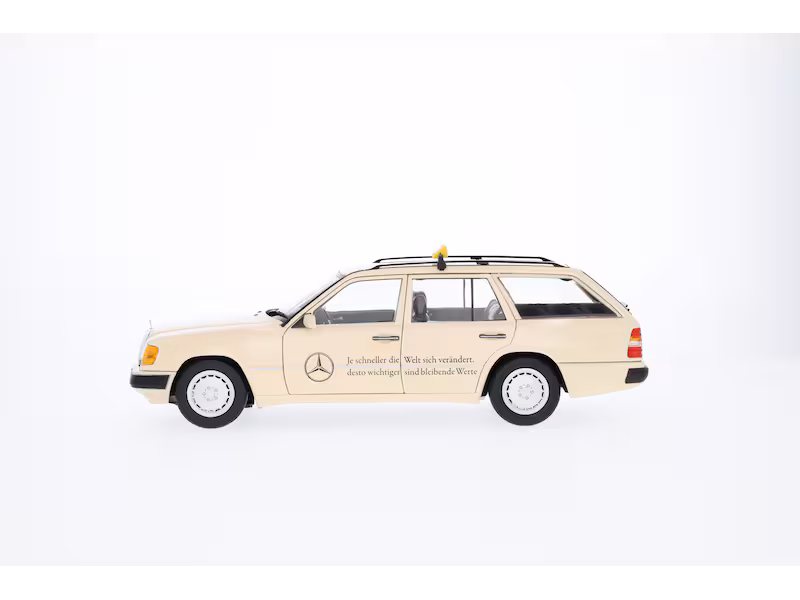 La seconda generazione di T-Model, che fece il suo debutto al Salone Internazionale dell'Automobile (IAA) di Francoforte nel 1985, era molto popolare tra i privati e veniva spesso utilizzata come taxi. Come i loro predecessori, anche questi T-Model furono prodotti nello stabilimento di Brema, che all'epoca era passato esclusivamente alla produzione di autovetture. Pochi anni dopo, nel settembre 1989, la Casa automobilistica presentò all'IAA una gamma di modelli medi completamente rinnovata, che si distingueva soprattutto per le modifiche stilistiche. Particolarmente degne di nota erano le modanature laterali di protezione della fiancata, che distinguevano i nuovi modelli dai loro predecessori. Il modello in miniatura della 300 D S 124 Estate è un vero e proprio richiamo visivo e ricalca in ogni dettaglio la sua controparte più grande. Gli interni, fedelmente disegnati e rivestiti, fanno battere il cuore dei collezionisti, così come le sei parti apribili del modello in scala 1:18 (porte, portellone posteriore e cofano). Un altro punto di forza è la verniciatura in un colore autentico, con una stella e la scritta "Più il mondo cambia velocemente, più i valori duraturi sono importanti" sul lato del conducente e del passeggero. Il modello di precisione, assemblato a mano con oltre 118 pezzi singoli, viene fornito in una confezione Mercedes-Benz Classic. Sono inclusi anche un cacciavite e un guanto per proteggere il modello dalle impronte digitali.