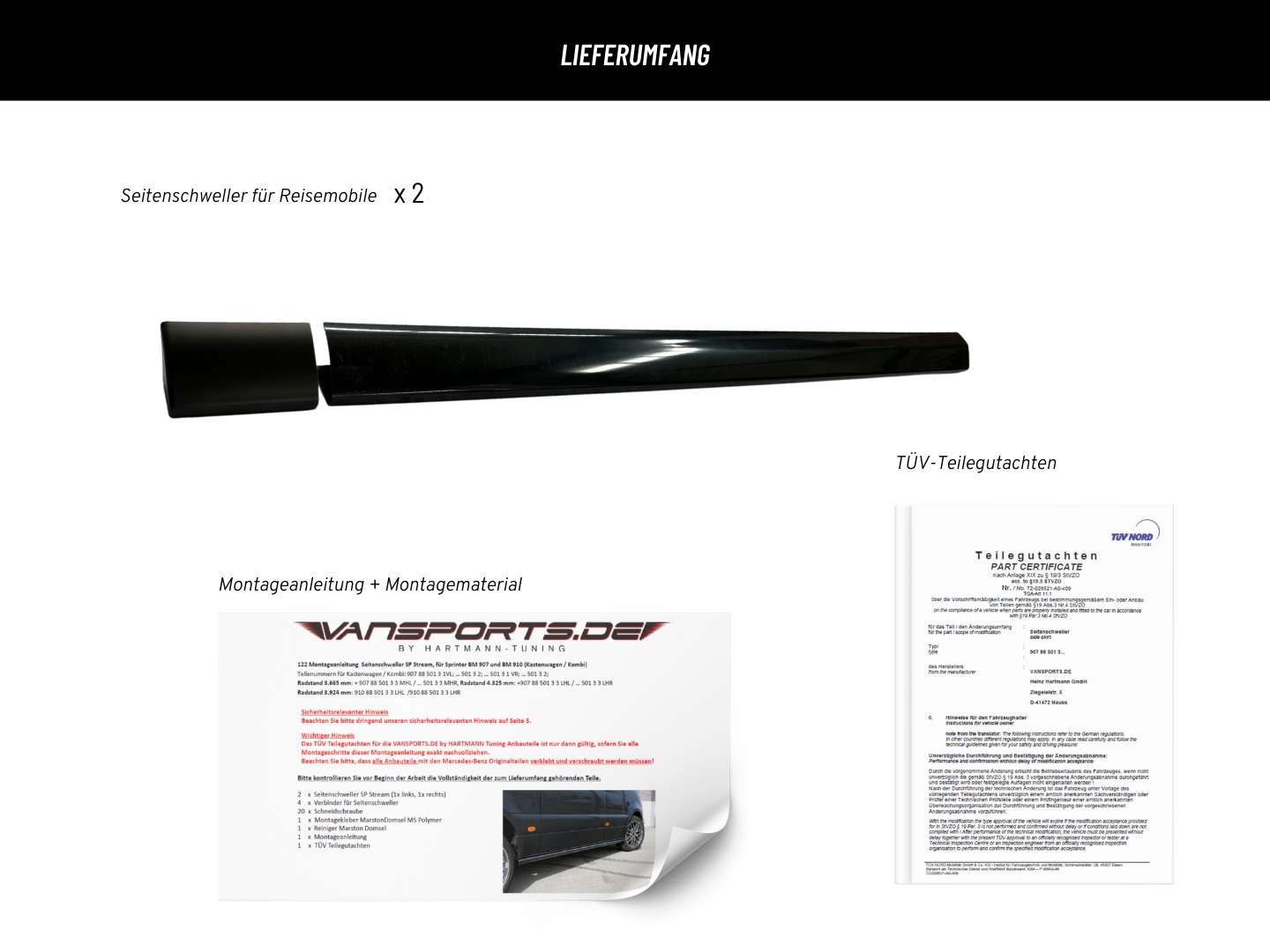 Minigonne laterali HARTMANN SP STREAM (destra e sinistra) XS Minigonne laterali in ABS per il montaggio adesivo e a vite sulle minigonne laterali Sprinter standard [BM 907 e 910] a partire dal modello anno 06/2018, La fornitura comprende il materiale di montaggio, il certificato TÜV e le istruzioni di montaggio. L'installazione è semplice grazie all'incollaggio e all'avvitamento, il tempo di montaggio è di circa 60 minuti. Nota: adatto solo per telai con cabina, ad esempio camper e veicoli a pianale.