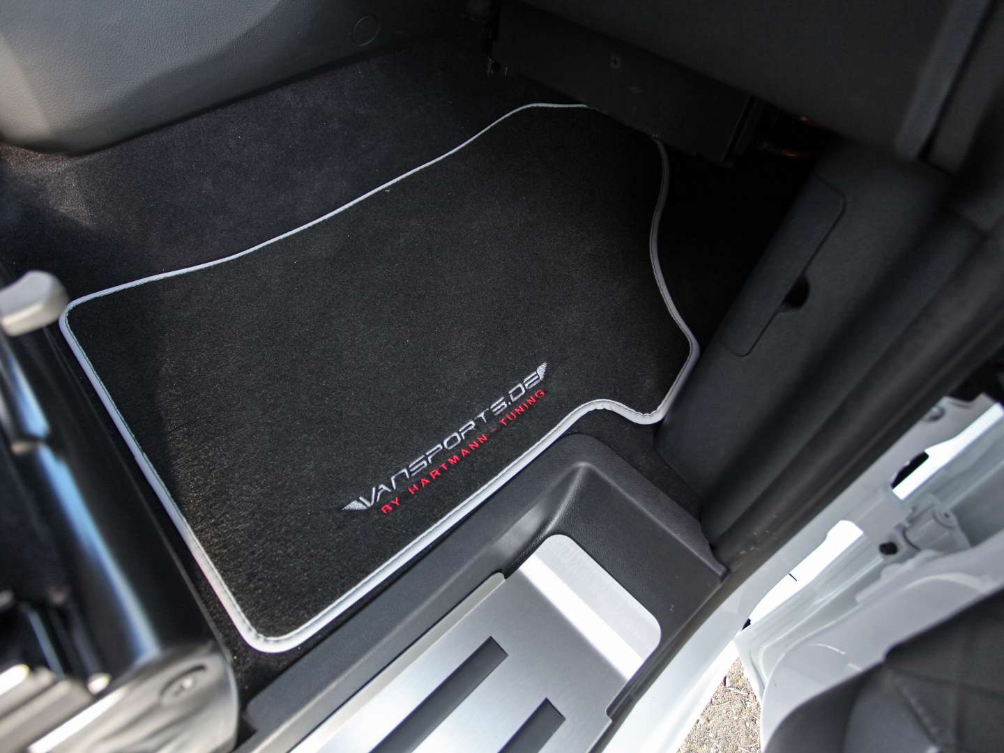 Il set di tappetini in 2 pezzi di VANSPORTS è perfetto per il vano piedi del conducente e del passeggero anteriore della vostra Mercedes-Benz Classe V/Vito 447. Sono disponibili in un elegante velluto color antracite con bordi neri e recano il logo Vansports. Si prega di notare che i tappetini sono forniti con cuciture nere, a differenza delle immagini.