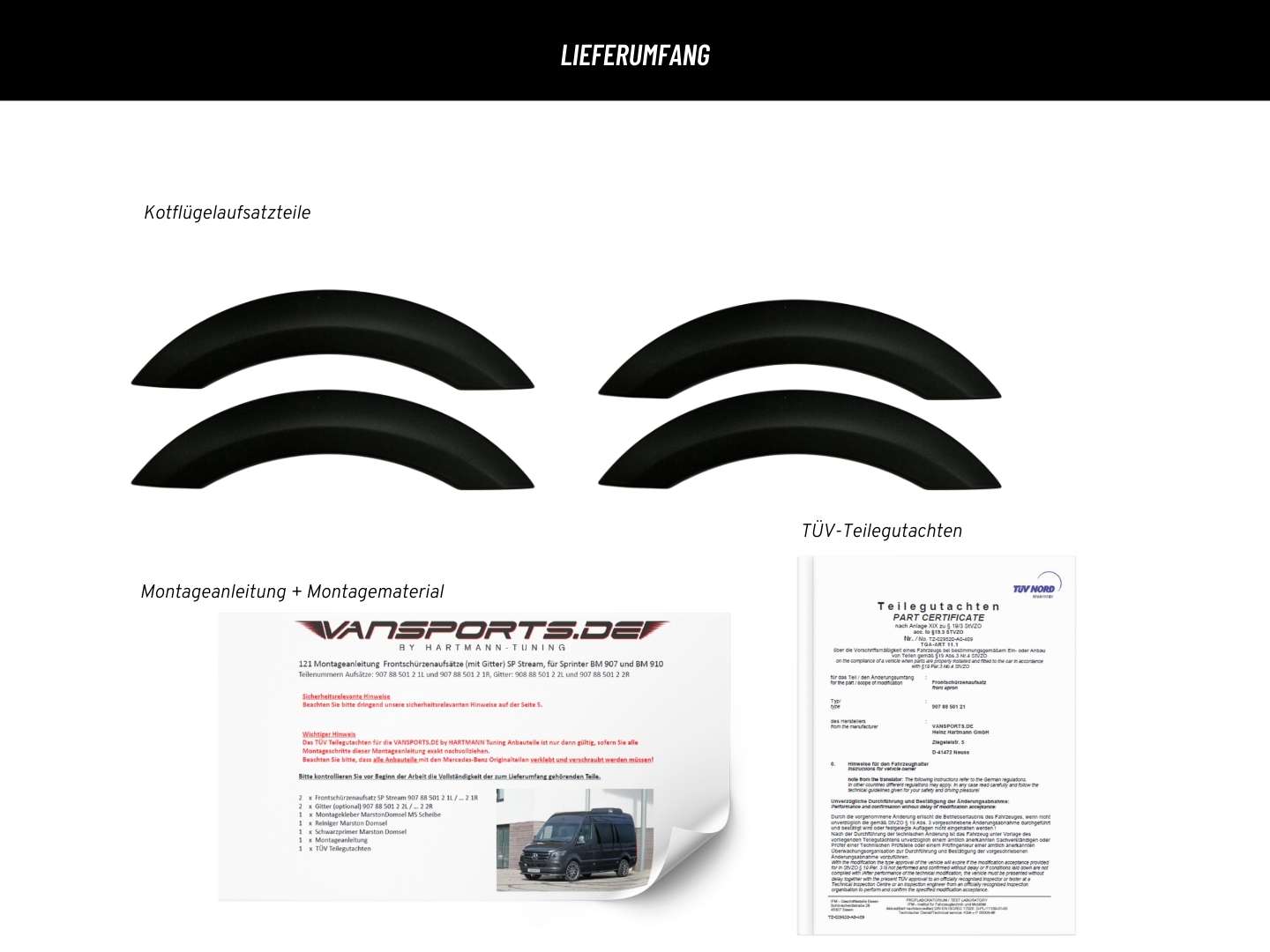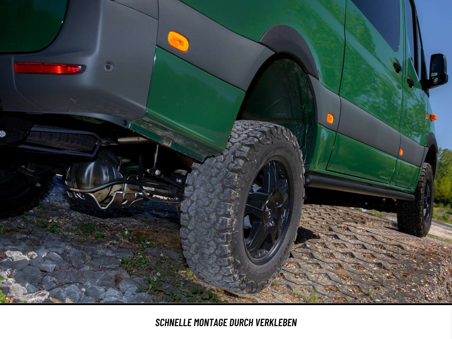 Steinschlag- und Astabweiser 4-teilige Radlaufverbreiterungen für den Mercedes-Benz Sprinter (Modellreihe 907) Hochpräzise ABS-Zusatzteile in Herstellerqualität, zur Anbringung an den Radkästen / Kotflügeln des Sprinters Keine Lackierkosten, da die Radlaufverbreiterungen in der Oberflächenfarbe "schwarz-struktur" geliefert werden. Einfache Installation durch Verklebung. Montagezeit ca. 1 Stunde Das erforderliche Montagezubehör und eine Montageanleitung sind im Lieferumfang enthalten. Ein TÜV-Teilegutachten für den Sprinter (Modell 907) ist ebenfalls im Lieferumfang enthalten.