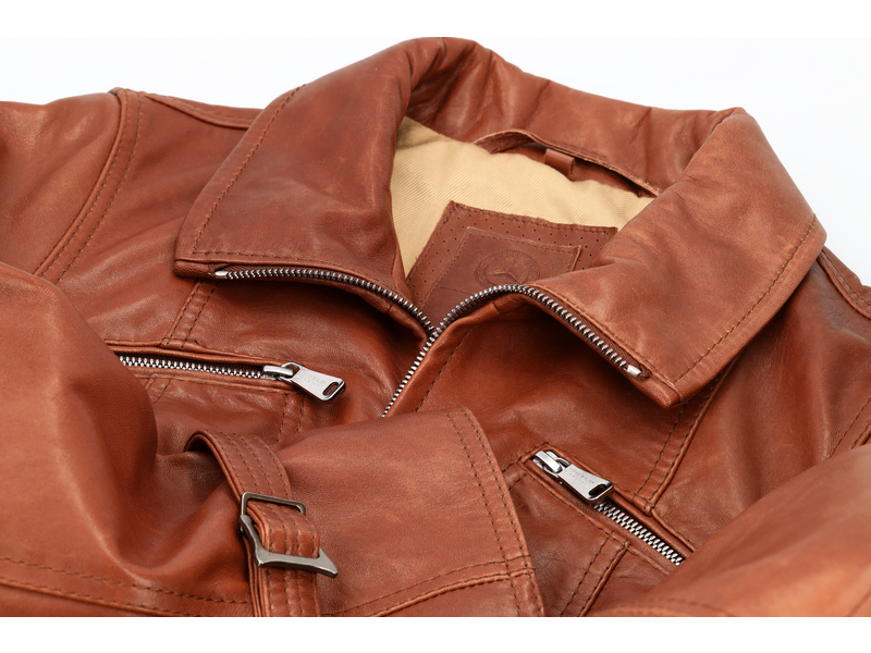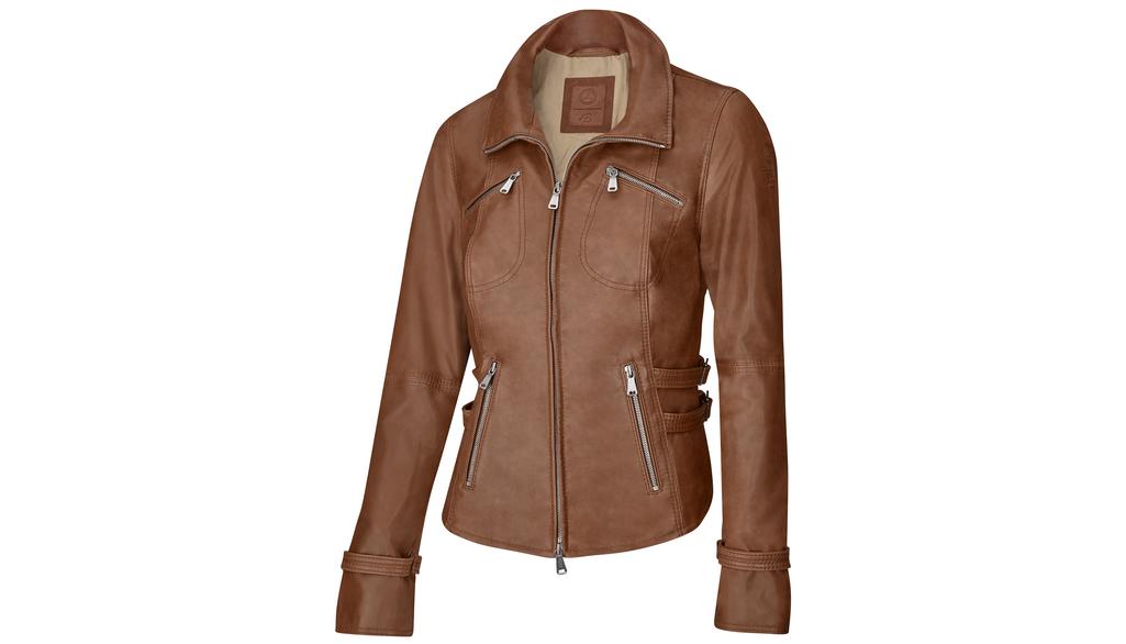 Diese Damen-Lederjacke aus Lammnappa in Cognacfarbe ist ein echtes Highlight. Der hochschließbare Kragen und der silberfarbene Reißverschluss sorgen für einen sicheren Sitz. Zwei Reißverschlusseingrifftaschen außen und eine Reißverschlusstasche und eine Paspeltasche innen bieten ausreichend Platz für Ihre wichtigsten Gegenstände. Verstellbare Riegel an der Taille und an den Ärmelabschlüssen ermöglichen eine individuelle Anpassung und sorgen für eine perfekte Passform. Der historische Stern und das Heinz Bauer Logo auf dem linken Ärmel machen die Jacke zu einem echten Blickfang. Die Jacke ist aus einer hochwertigen Verarbeitung gefertigt und besteht aus Lammnappa/Antikleder. Das Innenfutter besteht aus 51 % Baumwolle und 49 % Viskose. Diese Jacke ist ein Produkt der Manufaktur Heinz Bauer made for Mercedes-Benz und ist in den Größen 36-44 erhältlich.