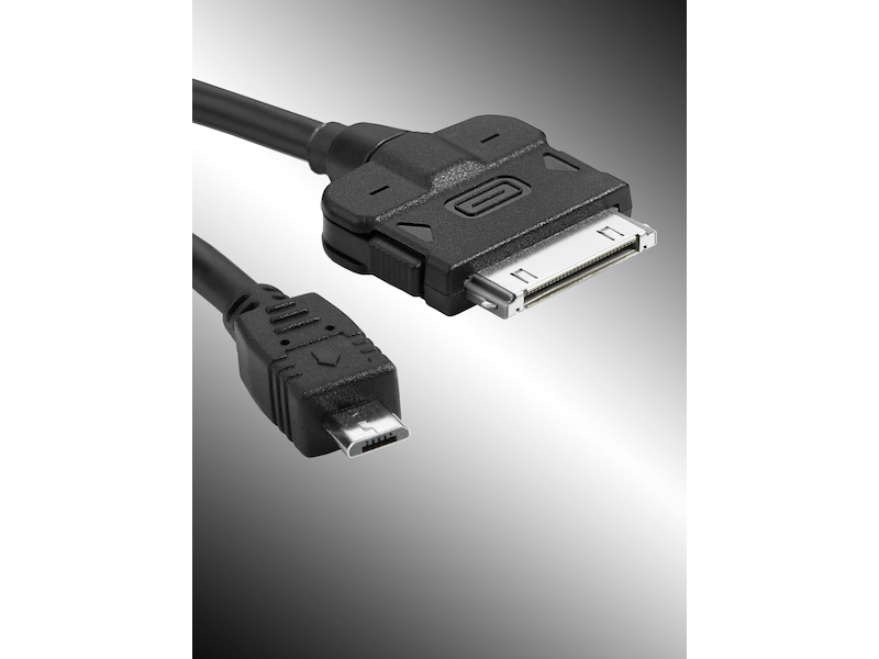 Das Kabel-Set ermöglicht den Anschluss eines 30-Pin Apple iPod®-Dock-Connectors und eines Mikro-USB.