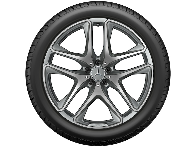 Dieses Komplettrad ist optimal für winterliche Straßenbedingungen. Die Felge besteht aus einem titangrauen, glanzgedrehten AMG 5-Doppelspeichen-Rad aus Aluminium.