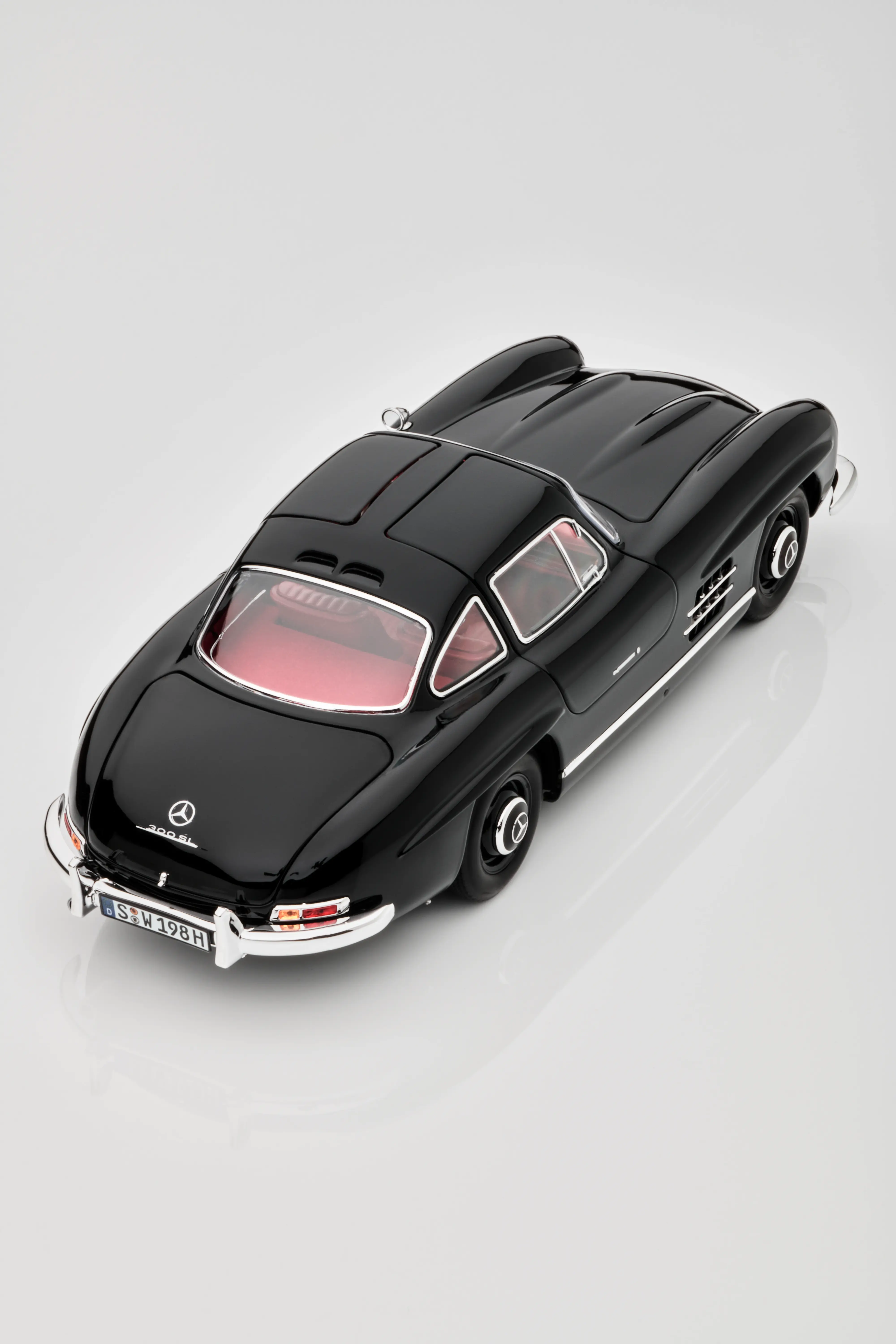 Ein ausgesprochenes Liebhaberfahrzeug, das bis heute nichts von seiner Faszination verloren hat: Der 300 SL Roadster, der 1957 auf dem Genfer Automobil-Salon als Nachfolger des legendären Flügeltürencoupés vorgestellt wurde, zählt seit Jahren zu den gefragtesten und bestnotierten Klassikern. Das Fahrzeug, das technisch dem Coupé entspricht, zeichnet sich durch eine verbeserte Hinterrad-Aufhängung aus und punktet durch deutlich verbesserte Fahreigenschaften. Als Präzisionsmodell hält der Sportwagen nun Einzug in die heimische Sammlung. Dabei präsentiert sich das Modellauto in höchster Detailtreue, was sich nicht nur in der Lackierung im authentischen Farbton, sondern auch in der detailgetreuen Darstellung sämtlicher Interieur Details widerspiegelt. Türen, Motorhaube und Heckklappe des Modells lassen sich öffnen und gewähren den Blick ins Innere des Wagens. Das Modellauto wird in einer Mercedes-Benz Classic Verpackung geliefert. Dieser liegt ein Schraubendreher zur leichten Entnahme des Modells sowie ein Handschuh zum Schutz vor Fingerabdrücken auf der Karosserie oder der Verglasung bei.