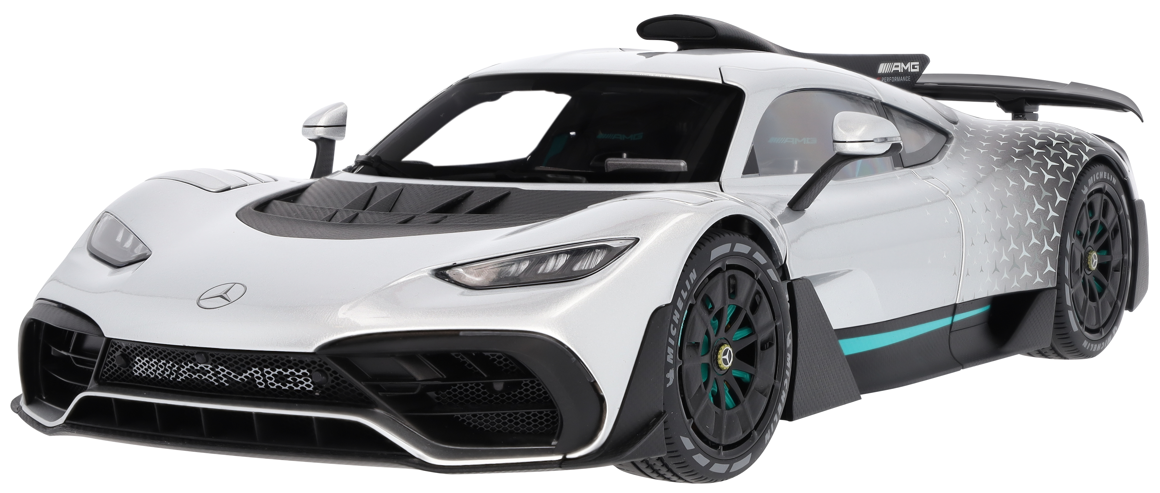 Der Mercedes-AMG ONE steht für reines, sportliches Fahren auf höchstem Niveau. Dieses moderne Straßenrennauto, inspiriert von der Formel 1, bietet eine unglaubliche Leistung. Dies wird durch den E PERFORMANCE-Plug-in-Hybrid ermöglicht, der aus der Eliteklasse stammt und einen 1,6-Liter-V6-Turbobenzinmotor und vier Elektromotoren für Turbolader, Kurbelwelle und Vorderachsen kombiniert, um eine beeindruckende Systemleistung von 1.063 PS zu erzielen. Mit dem Modellauto des Mercedes-AMG ONE C298 holen Sie sich die Legende in Ihre Sammlung. Das Präzisionsmodell wurde mit größter Sorgfalt nach den Original-CAD-Daten erstellt und überzeugt nicht nur durch seine authentische Lackierung, sondern auch durch eine originalgetreue Darstellung aller Interieur-Details. Fahrer- und Beifahrertür des Modells lassen sich öffnen und ermöglichen einen Einblick in das Innere des Autos. Darüber hinaus sind verschiedene Teile des Modellautos beweglich, wie die Loops auf den Kotflügeln, die Motorraumpaneele, der Heckspoiler, die Tankklappe und die Stromladeklappe sowie die Unterboden-Lüftungsklappen. Das Modellauto wird in einer Mercedes-AMG Verpackung geliefert, die einen Schraubendreher für die einfache Entnahme und einen Handschuh zum Schutz vor Fingerabdrücken auf der Verglasung und Karosserie enthält.