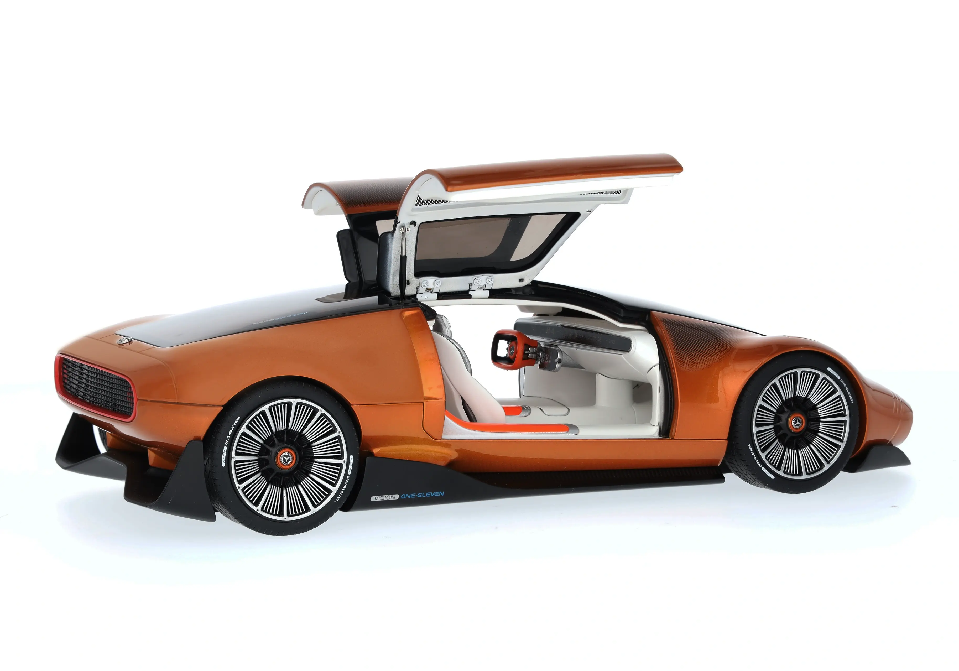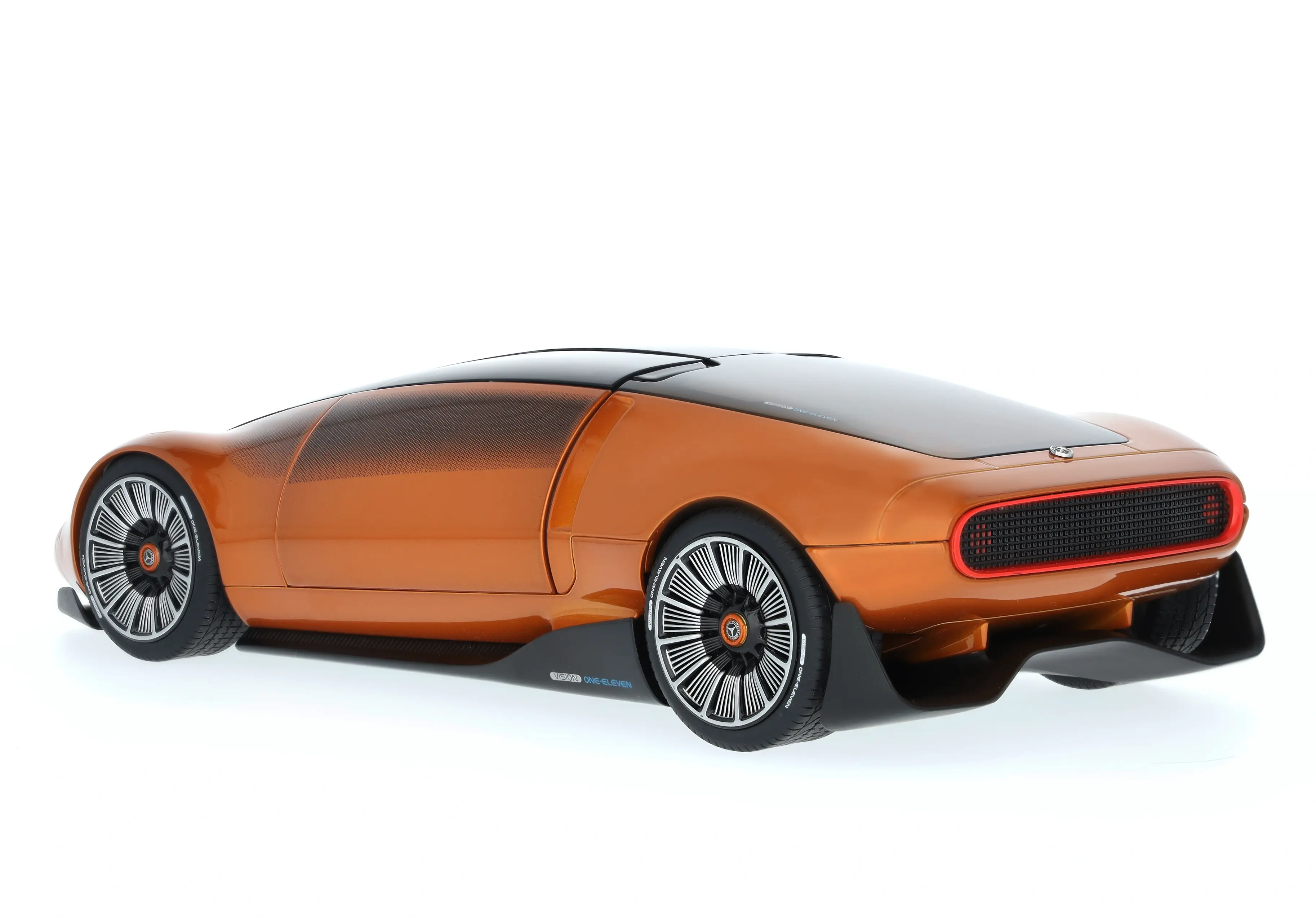 Eine Sportwagenstudie mit überaus dynamischer Formensprache und innovativer, vollelektrischer Antriebstechnologie: Der Mercedes-Benz Vision One-Eleven öffnet die Türen zur Zukunft – und das im wahrsten Sinne des Wortes. So weist die neue Studie, die in ihrer Form stark an den C 111 erinnert, nicht nur eine athletische, sehr flache Silhouette im One-Bow Design auf, sondern ist zudem mit bündig eingepassten Flügeltüren ausgestattet, die für futuristische Eleganz stehen. Der Innenraum zeigt erstmals ein Sportwagen-Interieur mit Lounge-Konzept, während zu den technischen Highlights insbesondere der leistungsstarke und hocheffiziente Axialfluss-Motor zählt, eine Entwicklung des englischen Elektromotoren-Spezialisten YASA. In detailgetreuer Anlehnung an das Originalfahrzeug zeigt sich das Miniaturmodell des Vision One-Eleven und bringt ein Stück außergewöhnliches Design von Mercedes-Benz nach Hause. Das Modell ist eine höchstdetaillierte Nachbildung der spektakulären Sportwagenstudie und wird in einer Mercedes-Benz Verpackung geliefert.