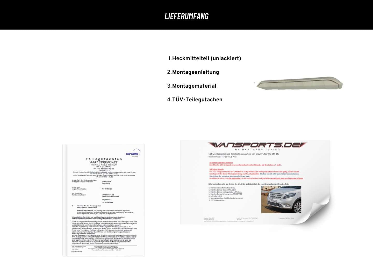 De VP Gravity achterskirt bevestigingsset (2-delig) van robuust ABS-kunststof is speciaal ontworpen voor montage onder de originele achterskirt van de V-Klasse / Vito. Hij is geschikt voor Vito en V-Klasse modellen uitgerust met het CU4 aerodynamische pakket vanaf januari 2021. Let op: dit product is niet geschikt voor voertuigen met het AMG optiekpakket of die niet zijn uitgerust met het CU4 aerodynamicapakket. De levering omvat gedetailleerde montage-instructies, het benodigde montagemateriaal en een TÜV-onderdelencertificaat conform § 19 (3) nr. 4 StVZO voor de montage van voertuigonderdelen.