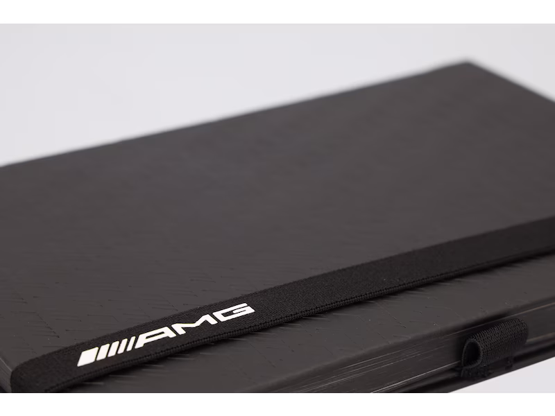 Het AMG Lanybook® is de perfecte plek om uw ideeën en concepten vast te leggen, zowel zakelijk als privé. Het maakt indruk met zijn hoogwaardige garensteek en ronde rug, waardoor het gemakkelijk te openen is. Het legt ook bijzondere nadruk op duurzaamheid: de 192 genummerde pagina's zijn gemaakt van 100% gerecycled en FSC®-gecertificeerd, 80 g Nautilus® Classic Office-papier, dat zorgt voor een prettige schrijfervaring. De omslag van NatureTouch-materiaal bevat tot 40% appel. Twee bladwijzers, één in wit en één in zwart, maken het gemakkelijk om je notities snel terug te vinden. De Lanybook® is visueel indrukwekkend met zijn zwarte kaft, die is voorzien van een AMG-diamantenpatroon, en de Lanyband, die is voorzien van een AMG-logo in witte 3D-siliconenprint. Een hoogwaardig bevestigingslint gemaakt van drie lagen garen en een kern van natuurlijk rubber, evenals lanyards waarmee de linten veilig in het boek kunnen worden bevestigd, ronden de algehele look af.