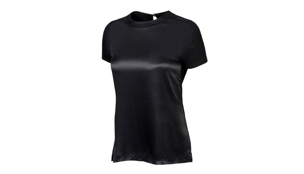 De zwarte blouse voor dames is een modieuze metgezel voor elke gelegenheid. Het is gemaakt van een mix van 75% viscose en 25% zijde voor de voorkant en 100% viscose single jersey voor de mouwen en achterkant. Dankzij de praktische zijsplitten biedt het een aangename moderne pasvorm en is het zeer comfortabel om te dragen. Een lus en een matgouden knoop achter bij de halslijn en een ton-sur-ton Mercedes-sterborduursel op de linker bovenarm ronden het ontwerp harmonieus af. Het shirt met halve mouwen is verkrijgbaar in de maten XS-XL zolang de voorraad strekt.