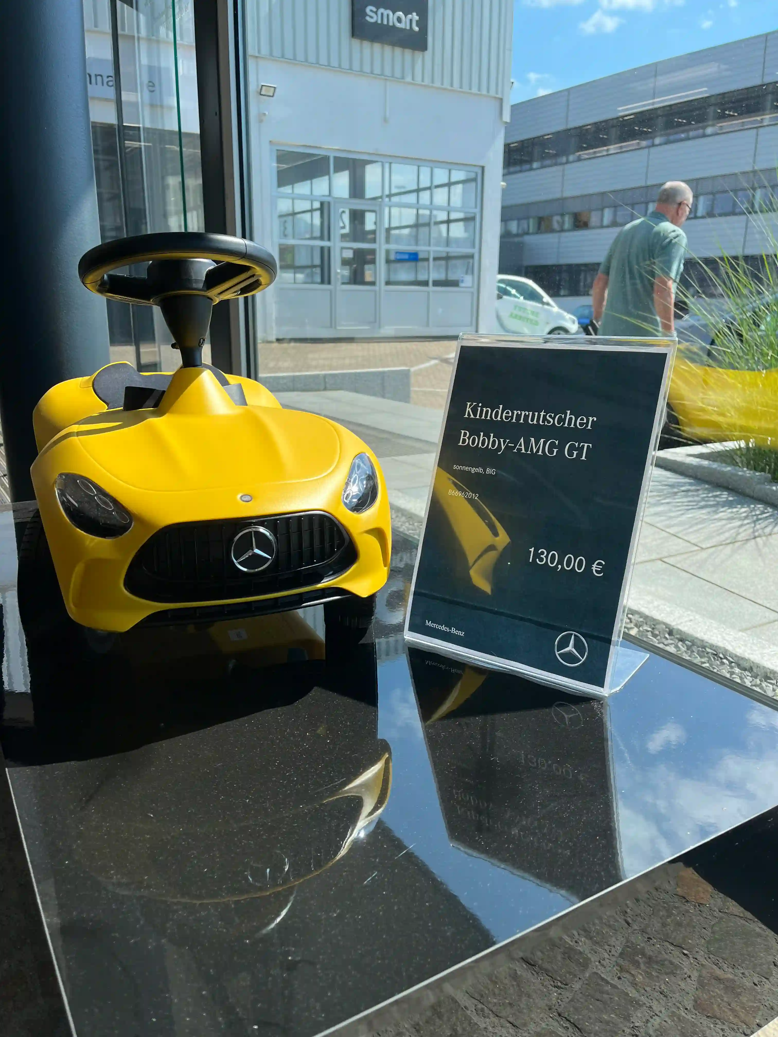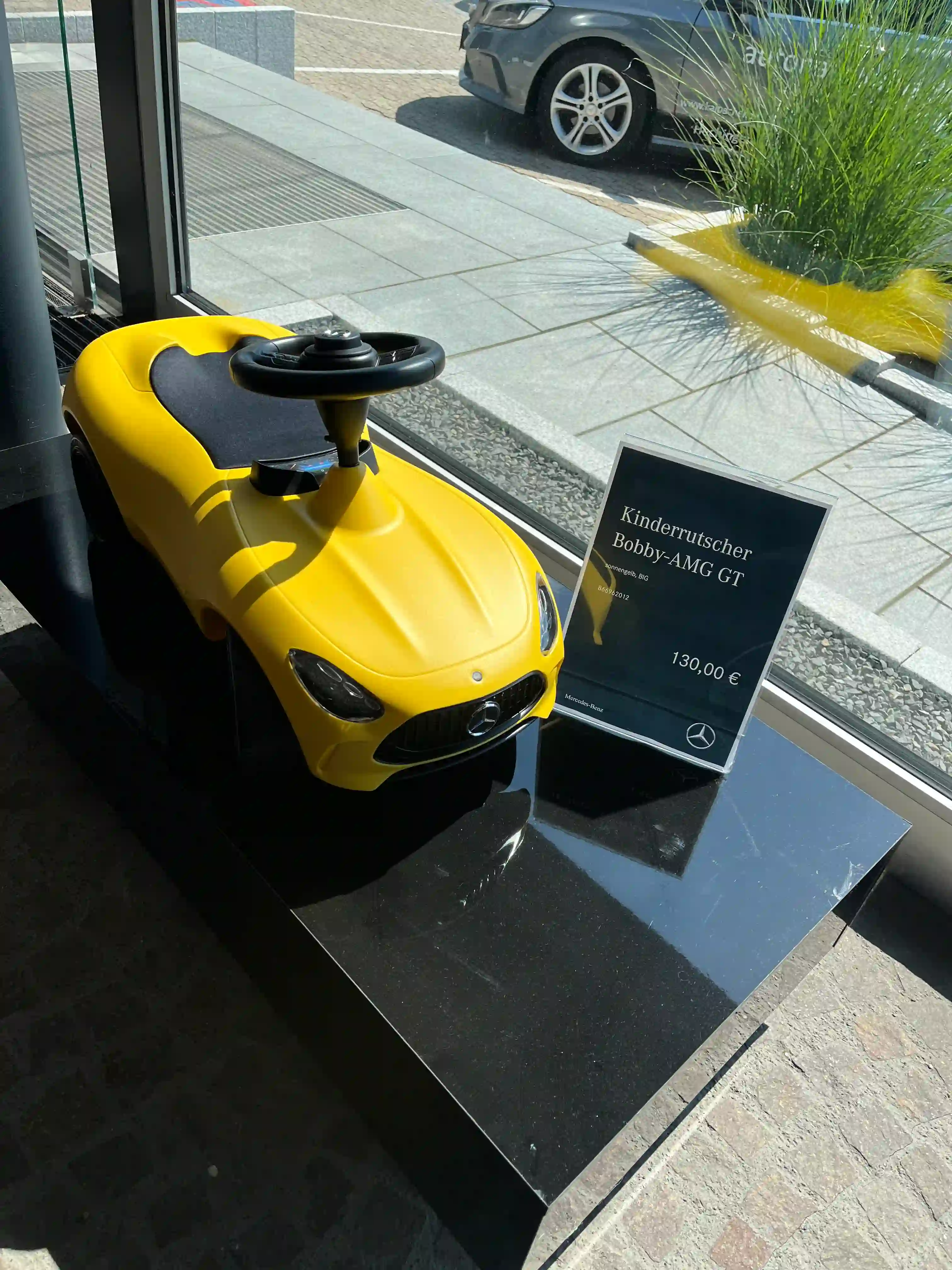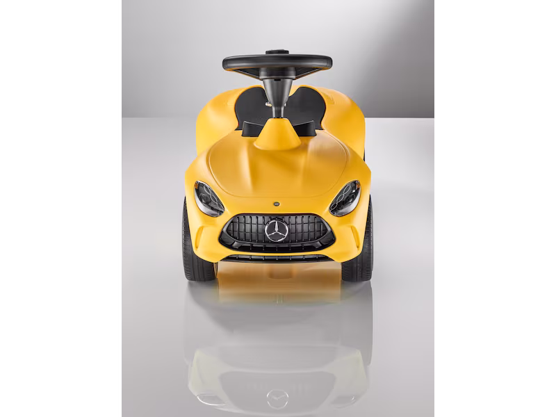 De Bobby-AMG GT kinderglijbaan belooft uren rijplezier voor de allerkleinsten (aanbevolen vanaf 18 maanden). Dit model is geïnspireerd op de nieuwe Mercedes-AMG GT en heeft een stuur in het authentieke Mercedes-AMG-design. Een zitting met een zitkussen van zwart schuim zorgt voor extra comfort. Dankzij de zwarte matte wielen in het nieuwe AMG-design met fluisterbanden in Michelin-profiel blijft de glijbaan altijd veilig op de grond. Verdere details van het rijdende kinderspeelgoed zijn de gedetailleerde voor- en achterkoplampen in heldere glaslook, evenals het radiatorrooster, de voorskirt en de achterdiffusor als afzonderlijke onderdelen. Met het meegeleverde stickervel kunnen afbeeldingen worden aangebracht op het display, het AMG-wapen op de motorkap, de ster op het kofferdeksel en de satellietknoppen op het stuurwiel.