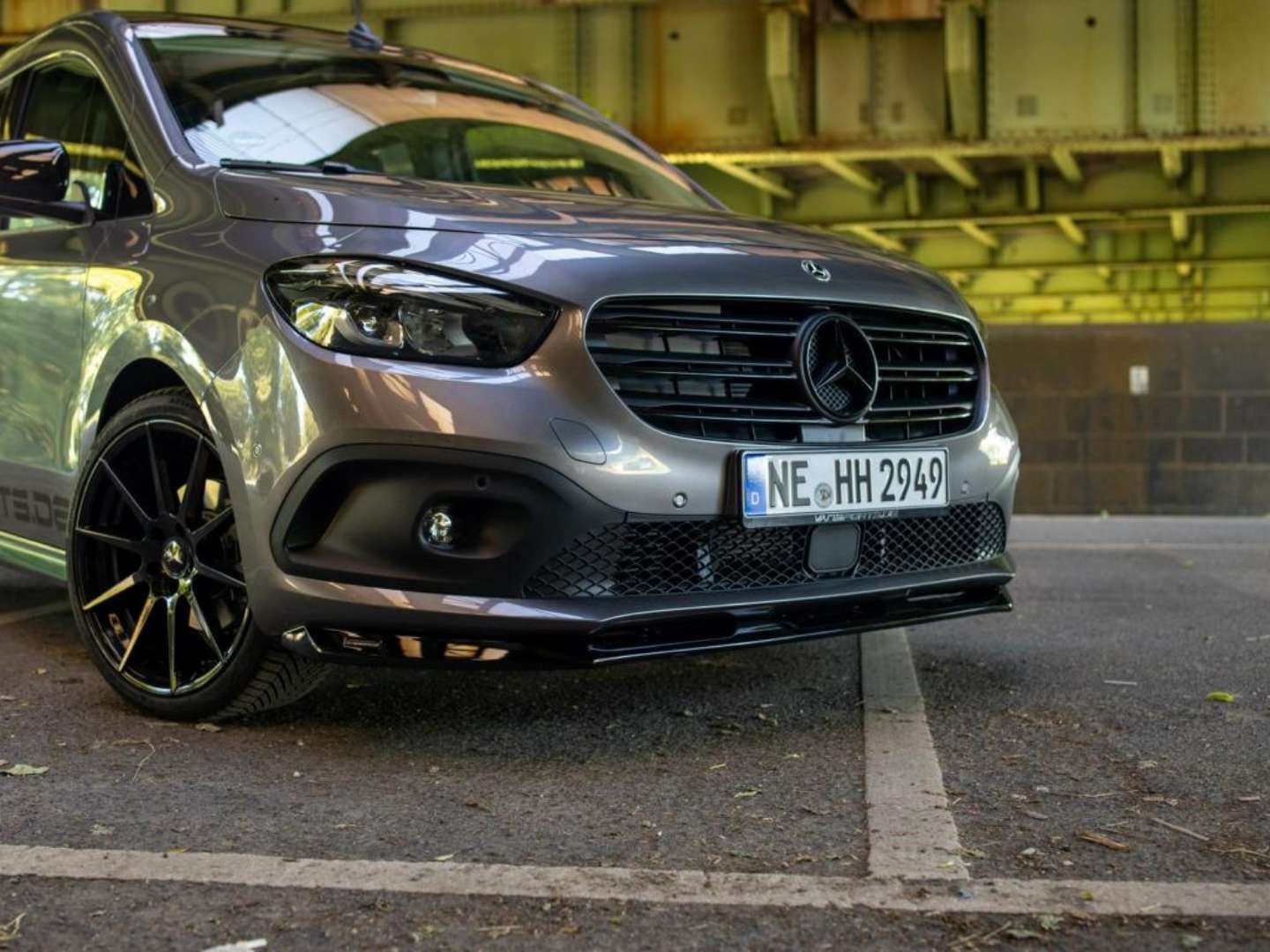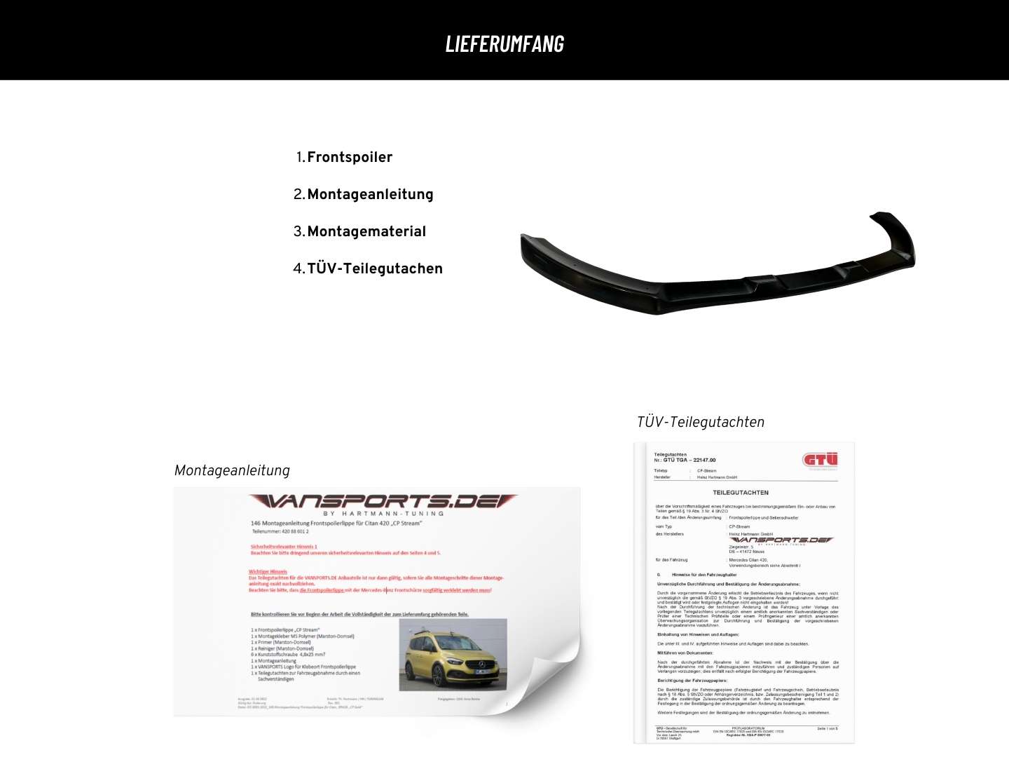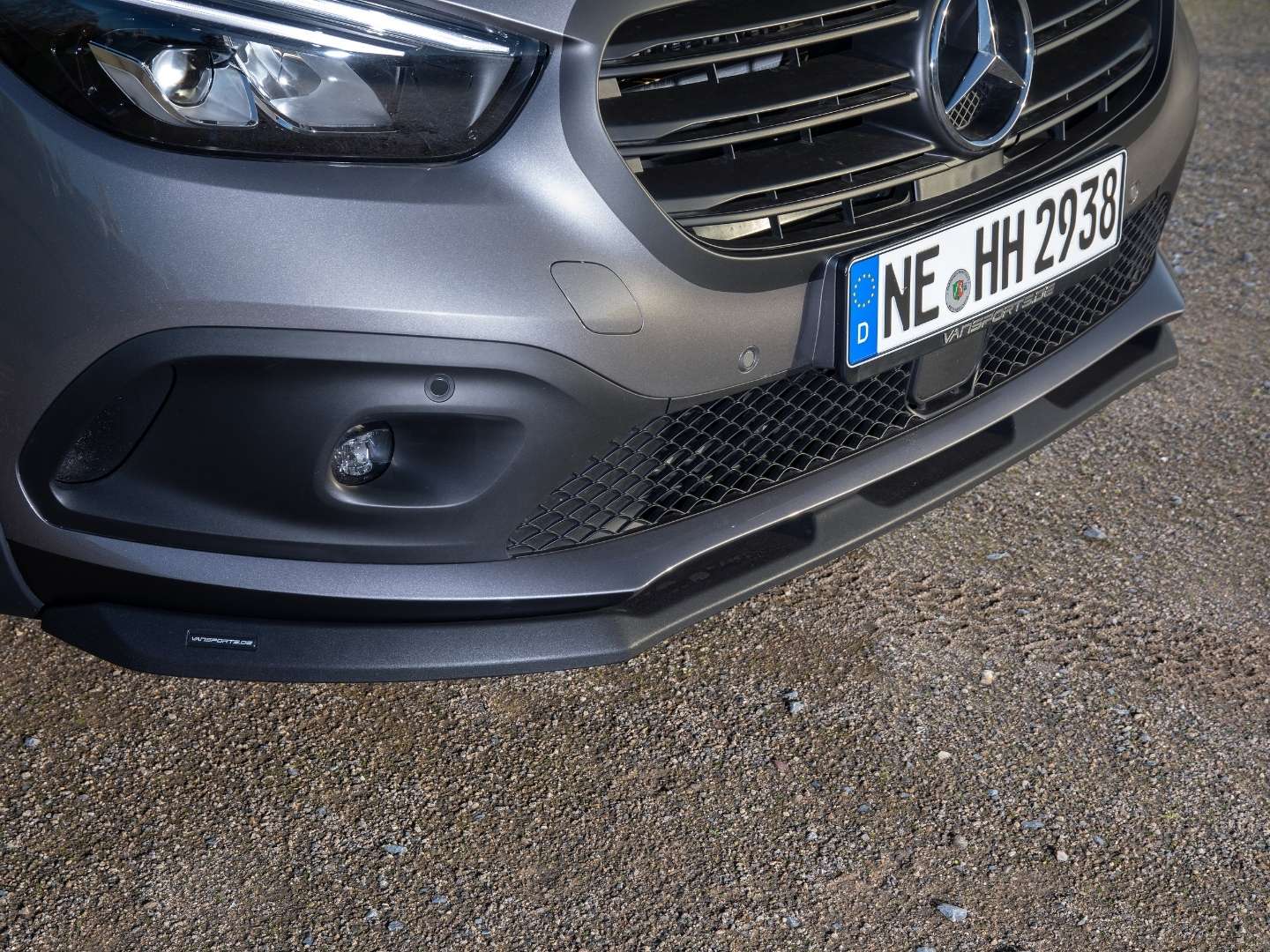 Voor Mercedes-Benz modelseries 420 Citan en T-Klasse PU-randspoilerlip voor montage onder de originele voorspoiler. De voorspoilerlip wordt geleverd in "zwart plastic" en moet voor montage worden gespoten. Gedetailleerde montage-instructies evenals montagetoebehoren en een onderdelenvergunning voor de bevestiging van voertuigonderdelen volgens § 19 (3) Nr. 4 StVZO zijn bij de levering inbegrepen.