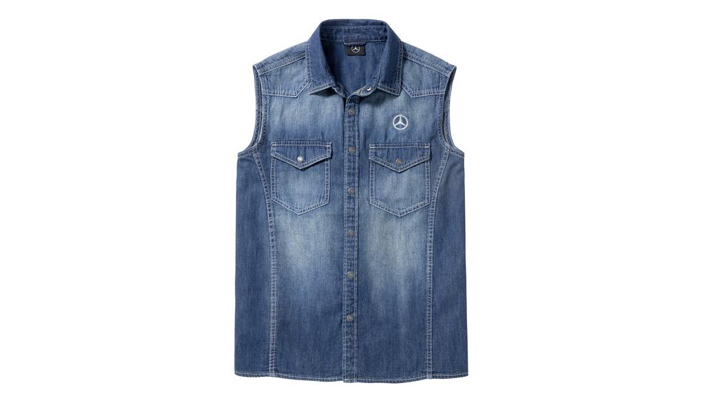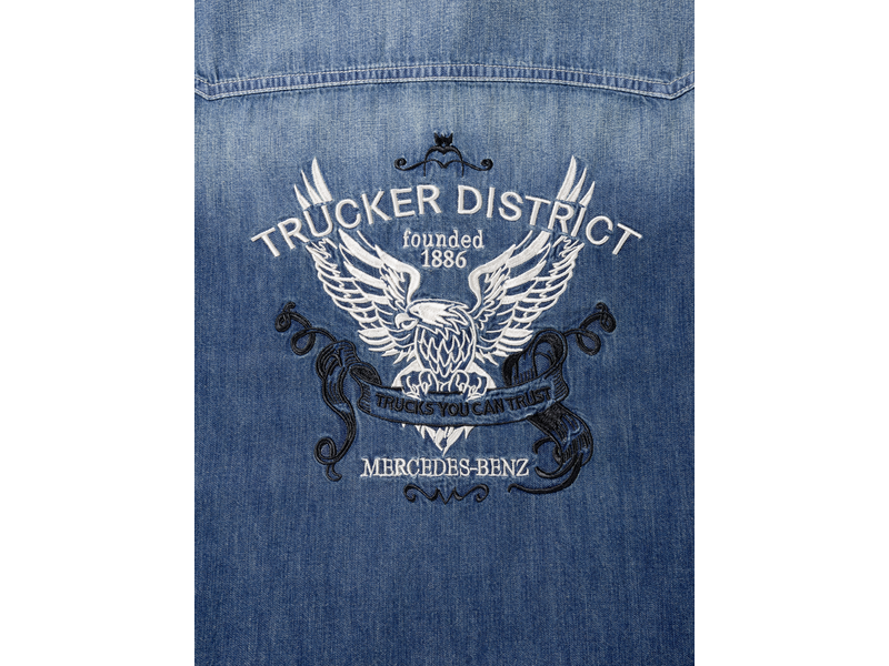 Het blauwe denim overhemd voor heren van puur katoen is een veelzijdige metgezel. Het overhemd is comfortabel om te dragen en heeft een modieus ontwerp. Het heeft een overhemdkraag, een juk voor en achter, twee klepzakken met drukknopen op de borst en een knoopsluiting met drukknopen met Mercedes-Benz opschrift. Een groot tweekleurig "Trucker District" borduursel op de achterkant springt in het oog. Zilvergrijze doorstiksels en nauwsluitende Weense naden maken de modieuze look compleet. Dit shirt is verkrijgbaar in de kleuren blue dark stone washed en in de maten S-XXXL en is gemaakt van 100% katoen.