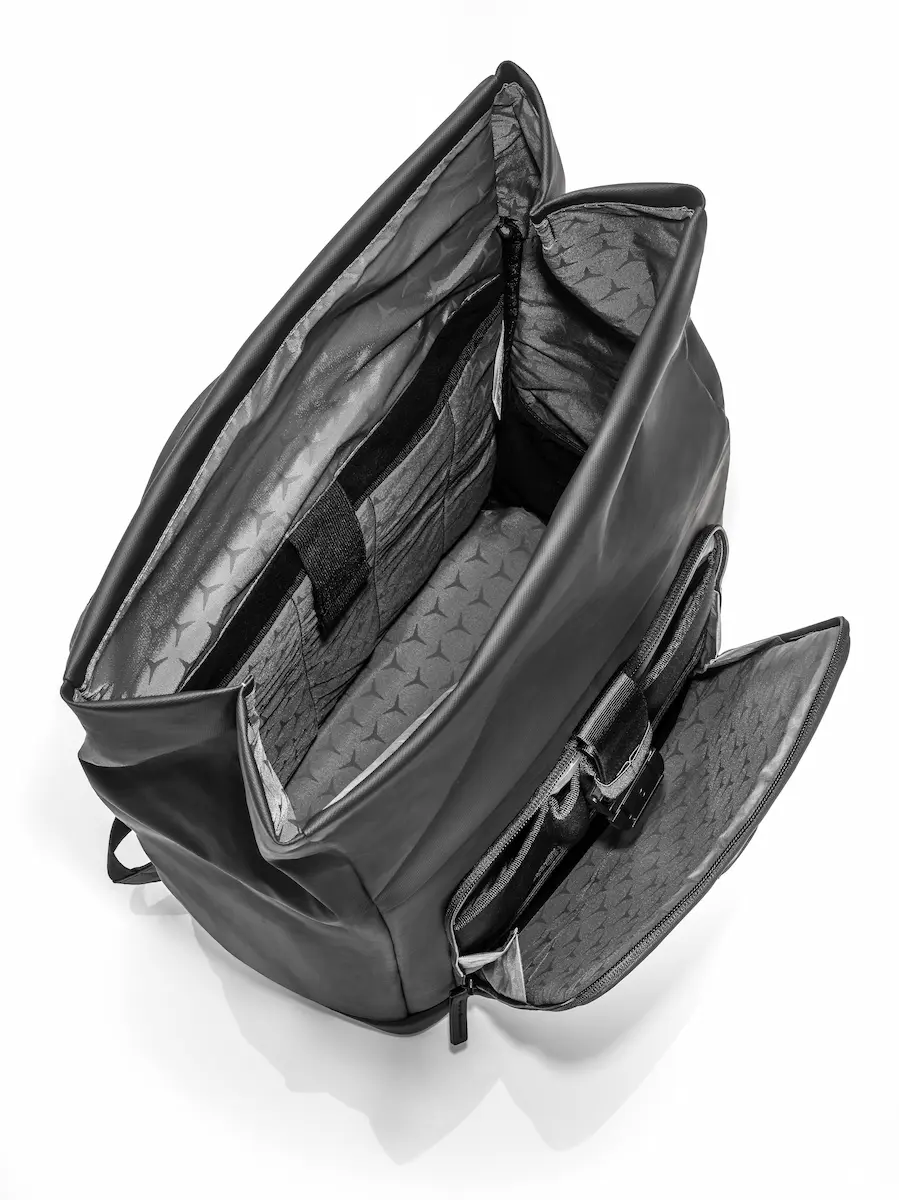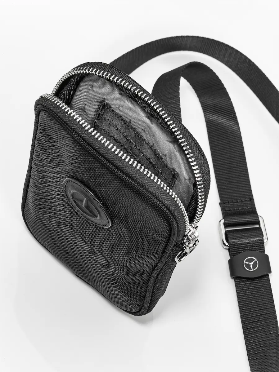 Het mobiele telefoonhoesje van gerecycled polyamide is een veelzijdig accessoire dat ruimte biedt aan een mobiele telefoon of smartphone. De interne afmetingen van het hoofdvak zijn ongeveer: 17cm x 10cm x 1,8cm. Het heeft ook 3 vakjes voor creditcards en een klein vierkant vakje voor een tracking tag met een maximale afmeting van 40mm x 40mm. Een verstelbare en afneembare schouderriem zorgt voor optimaal draagcomfort. De zilverkleurige ritsen en 3D-sterritstrekkers vormen een mooi contrast met het zwarte nylon materiaal. Opvallende branding geeft de schoudertas een exclusieve touch. Zowel de badge met logo als de andere lederen applicaties zijn gemaakt van hetzelfde leder dat wordt gebruikt voor de stoelen en accessoires van het luxueuze interieur van de Mercedes-Benz S-Klasse.