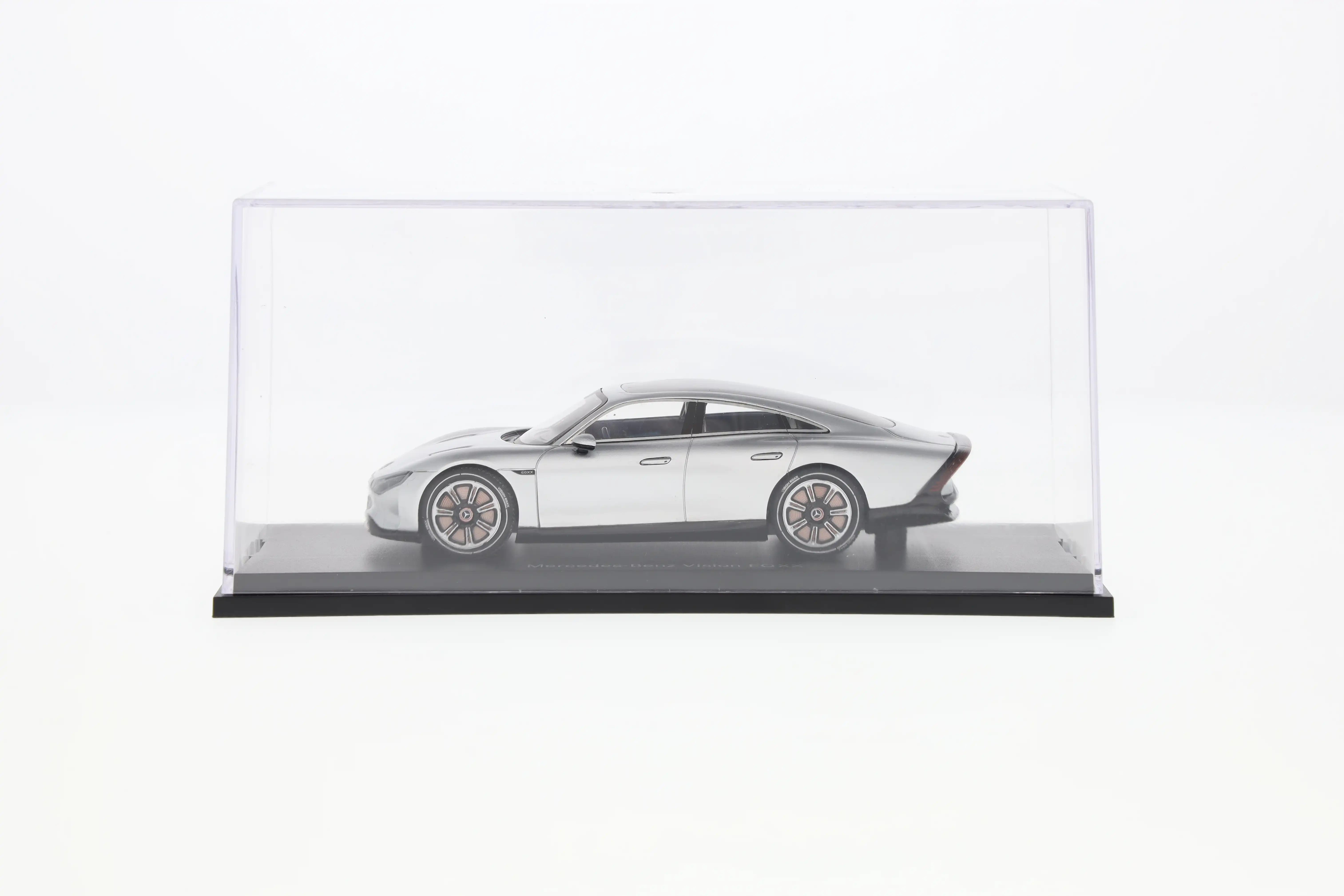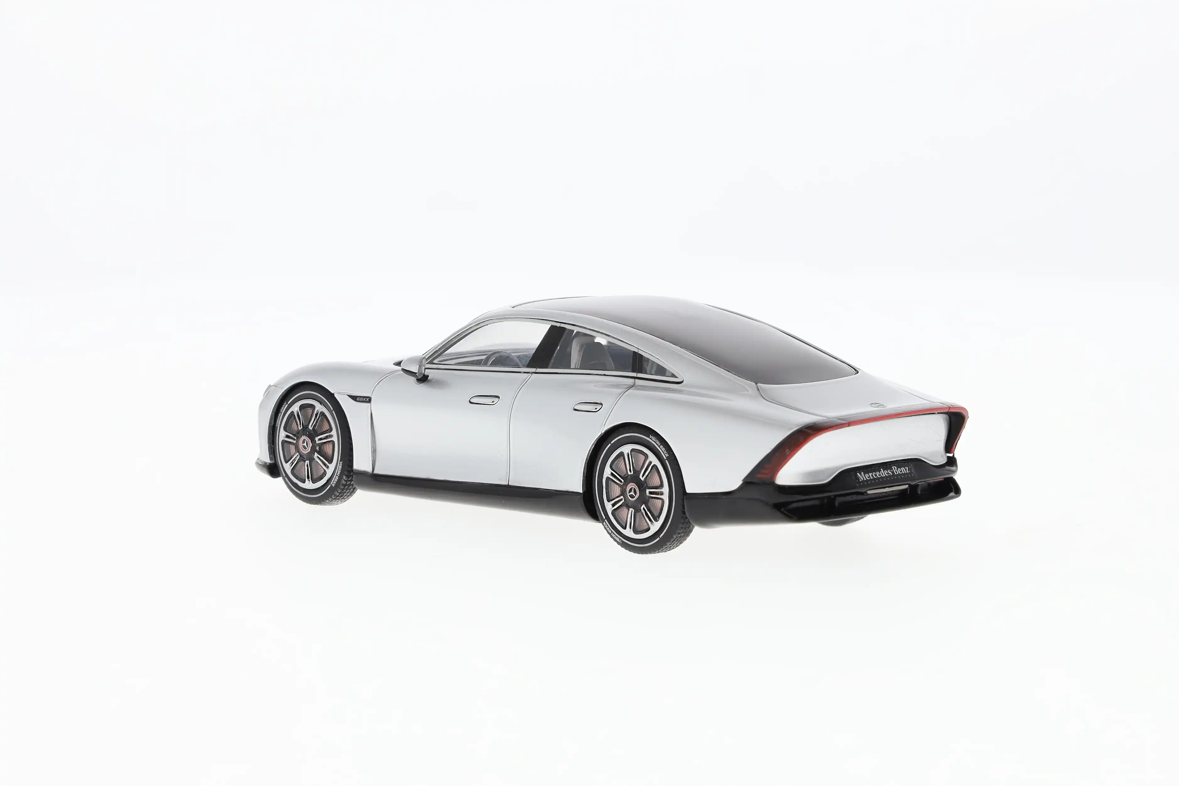 Met een actieradius van meer dan 1.000 km op één acculading en een energieverbruik van minder dan 10 kWh/100 km zet de VISION EQXX showauto de norm en is het een blauwdruk voor de toekomst van efficiëntie. Naast de moderne elektrische aandrijflijn, 's werelds beste luchtweerstandscoëfficiënt van cw 0,17 en de bionische lichtgewicht constructie, is de VISION EQXX ook een pionier op het gebied van een radicaal nieuwe softwaregestuurde UI/UX-benadering. De duurzame materialen die tastbare luxe mogelijk maken zijn ook baanbrekend. Deze omvatten dierproefvrije lederen alternatieven, evenals gerecyclede materialen in structurele onderdelen en een bionische ontwerpbenadering die het gewicht minimaliseert en hulpbronnen bespaart. Als modelauto wijst de VISION EQXX nu ook de weg naar de toekomst in huiselijke collecties en maakt indruk met het hoogste detailniveau. Het miniatuurmodel is gerealiseerd volgens de originele CAD-gegevens en in een authentieke kleur gespoten. Ook alle details in het interieur maken indruk met hun getrouwe weergave. De modelauto is gemonteerd op een sokkel en wordt geleverd in een Mercedes-Benz verpakking.