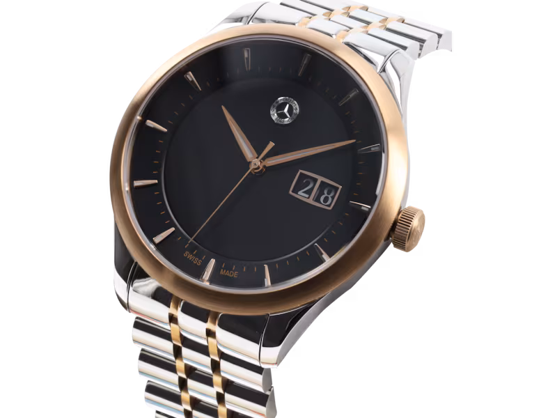 Met zijn elegante ontwerp en Zwitserse 510 BigDate kwartsuurwerk van Ronda is dit herenhorloge een echte blikvanger. Het heeft een gepolijste roestvrijstalen kast die wordt geaccentueerd door een goudkleurige en mat afgewerkte lunette. De zwarte wijzerplaat wordt beschermd door een antireflecterend en licht gebold saffierglas en wordt verder benadrukt door verhoogde, goudkleurige indexen. Een omlijst groot datumvenster biedt een duidelijke datumweergave. De zilver- en goudkleurige roestvrijstalen armband in tweekleurige look is zeer comfortabel om te dragen en kan veilig worden vastgemaakt met een elegante vlindersluiting. De goudkleurige elementen zijn voorzien van een PVD-coating. De indexen en wijzers zijn voorzien van SuperLumiNova® lichtgevend materiaal zodat de tijd zelfs in het donker goed af te lezen is. Het horloge is waterbestendig tot 5 ATM.
