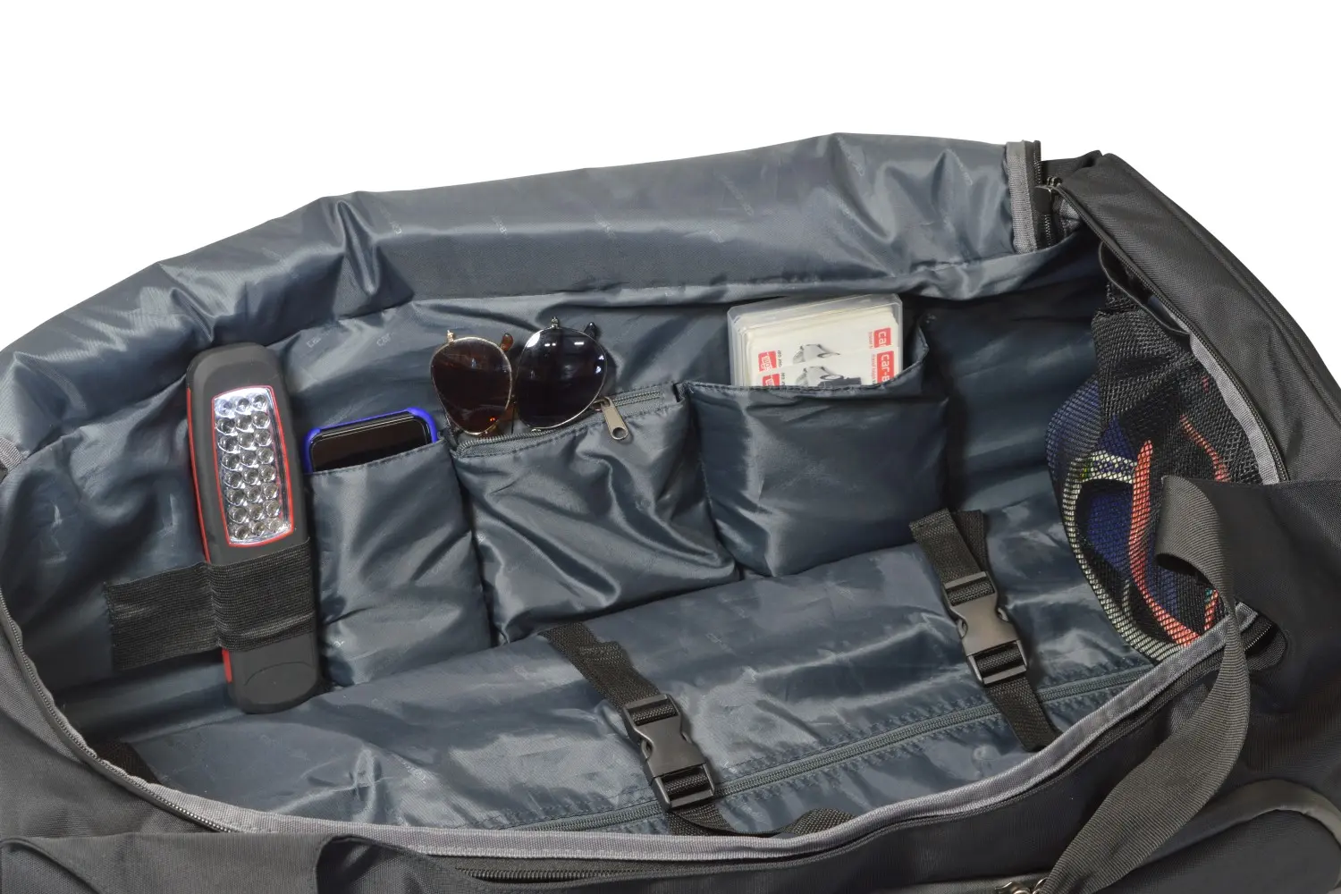 - Elke roltas heeft 2 of 3 spanbanden aan de binnenkant om de inhoud vast te zetten.