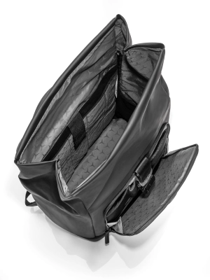 Der Mercedes-Benz G-Klasse Rolltop-Rucksack kombiniert markantes Design mit praktischer Funktionalität. Das schwarze Außenmaterial aus recyceltem Polyester wird durch Reißverschlussanhänger aus dem Leder des G-Klasse Interieurs ergänzt. Für hohen Tragekomfort sorgen gepolsterte Schultergurte und drei Rückenelemente aus Mesh. Im Inneren bietet der Rucksack ein großes Hauptfach, ein gepolstertes Laptopfach sowie ein Reißverschlussfach. Weitere Innenfächer, Stifthalter und eine Fronttasche runden das Platzangebot ab. Das Innenfutter besteht aus recyceltem Polyester mit Mercedes-Benz Pattern. Das Badge im Design der G-Klasse Ersatzradverkleidung rundet den Look ab.